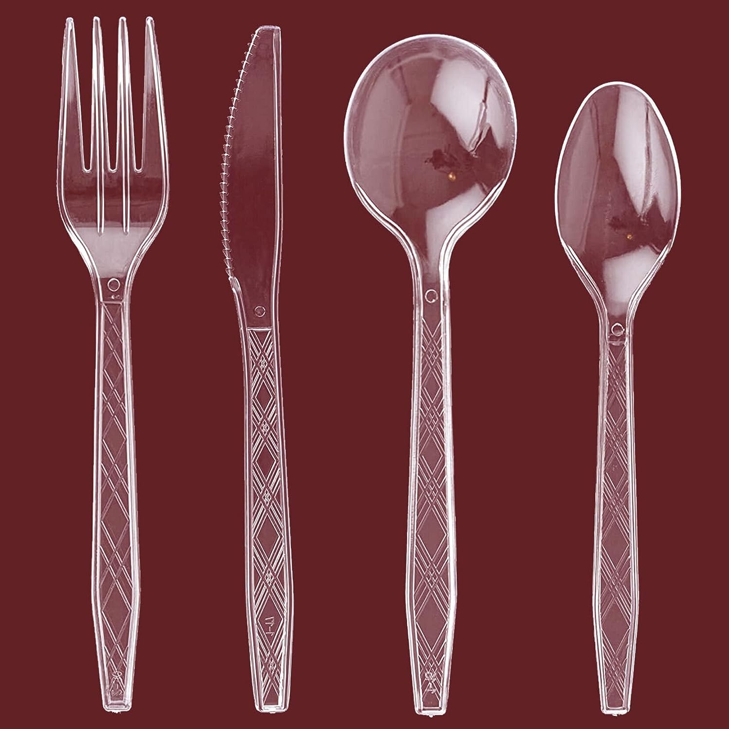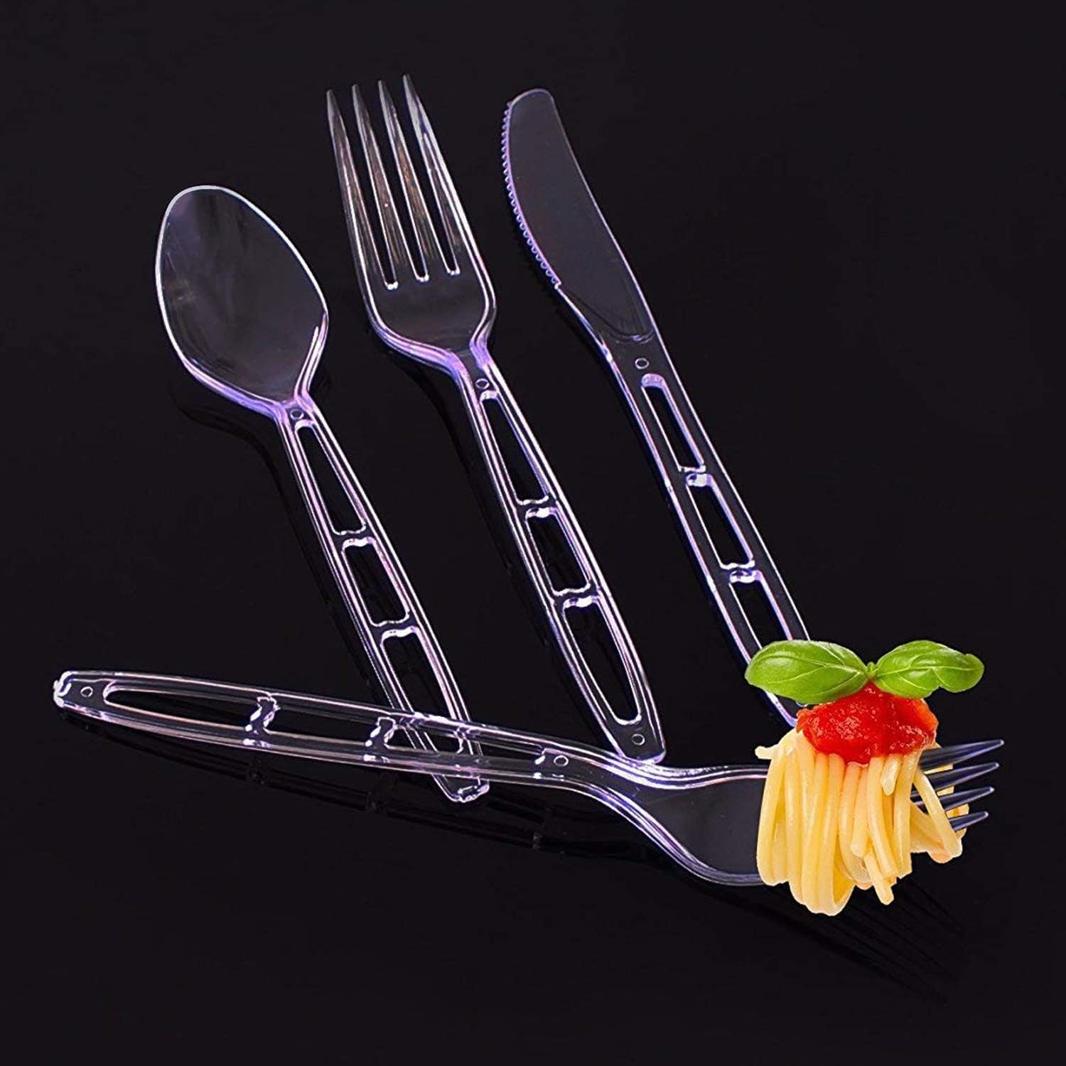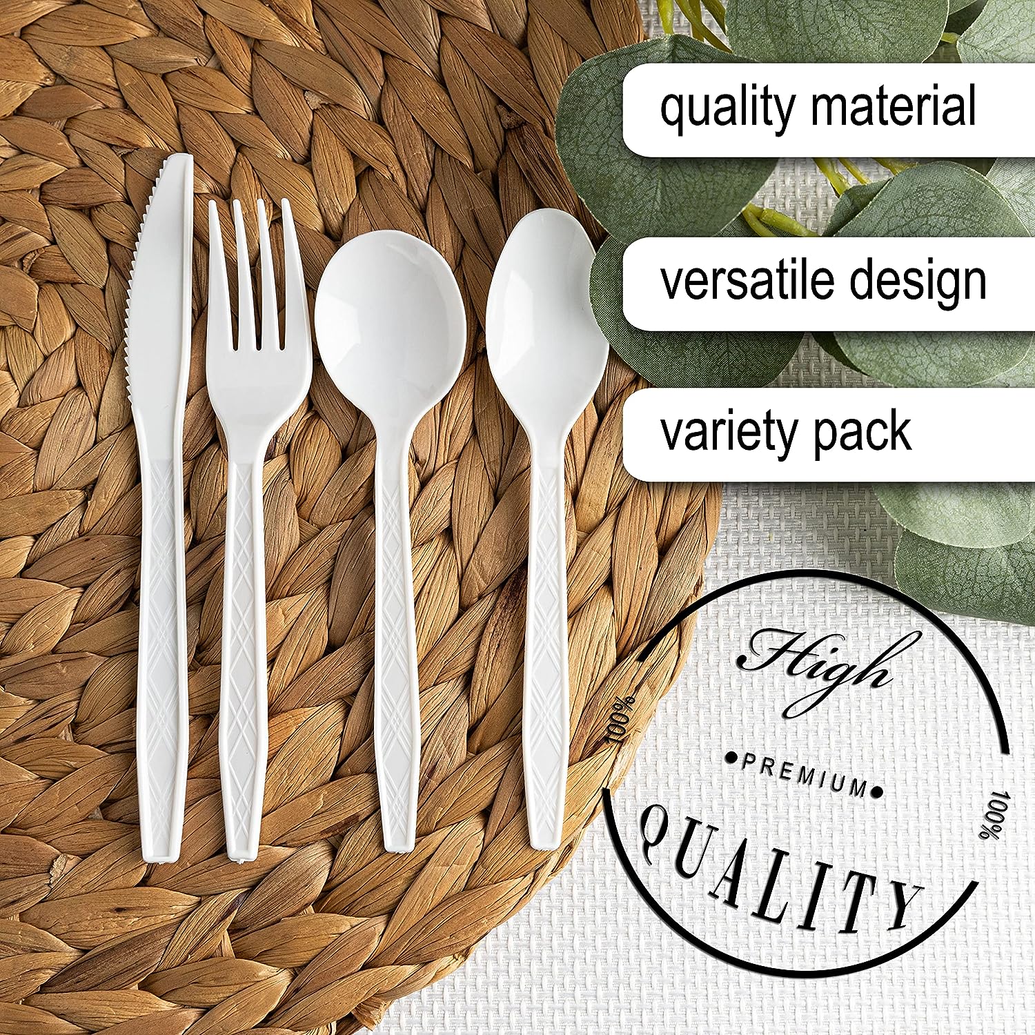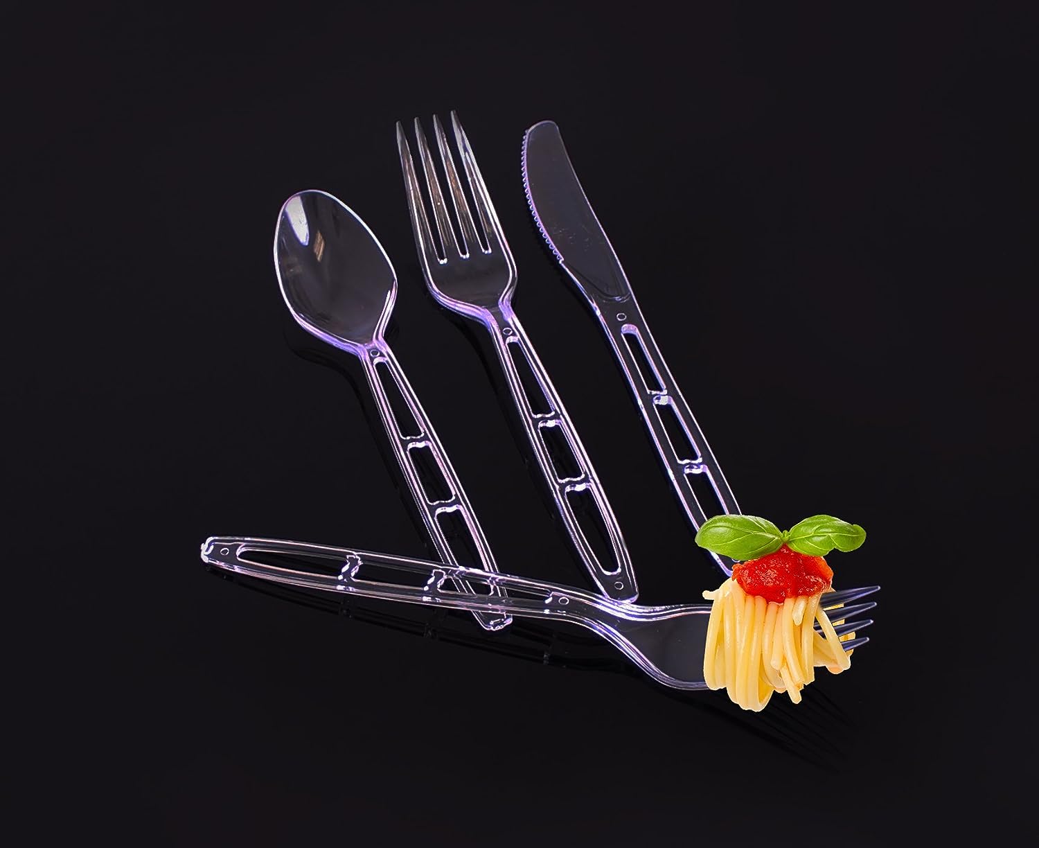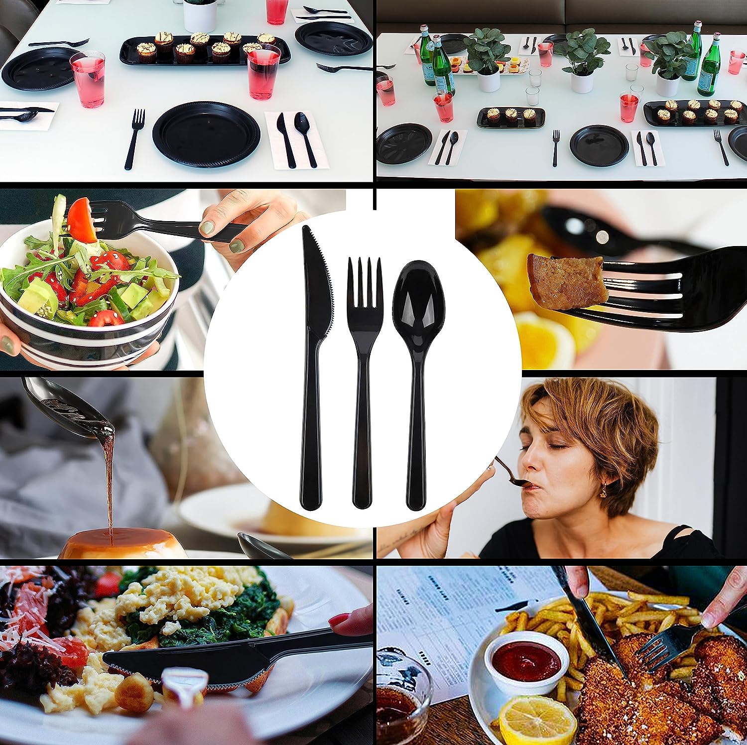 • ✅DURABLE: Heavy duty plasticware. Knives slice without breaking, strong forks spear food, spoons for hot or cold liquids.