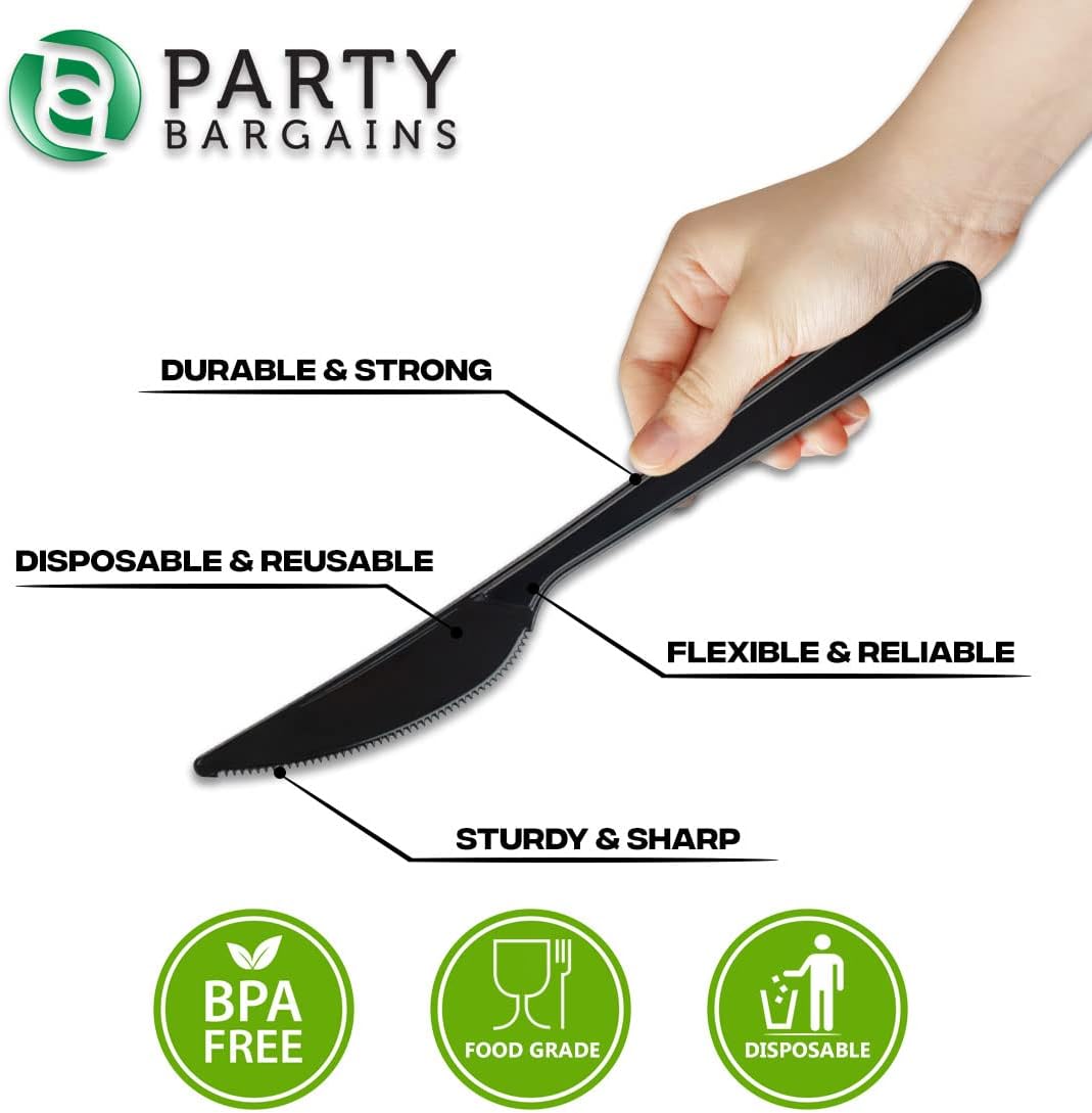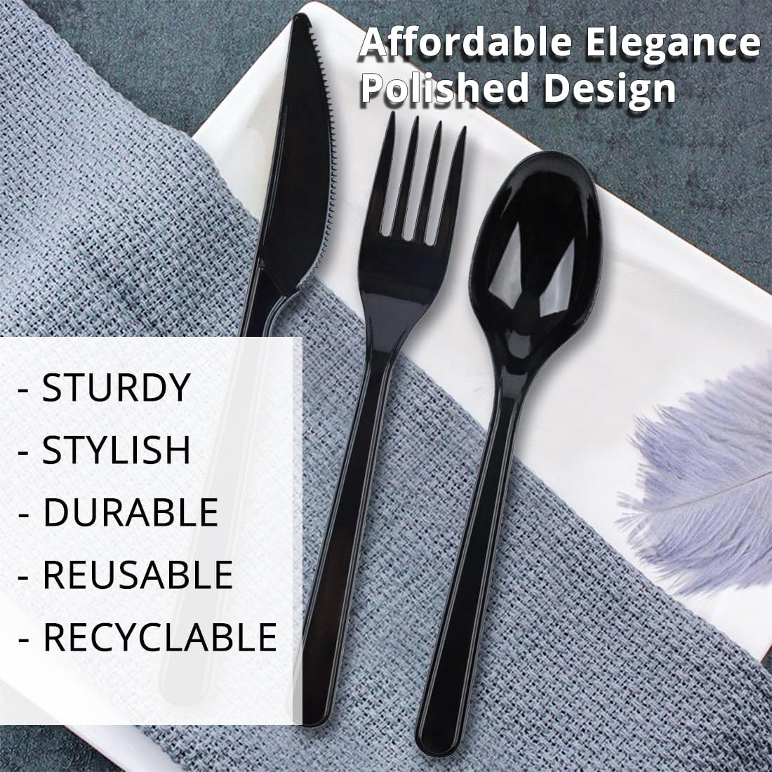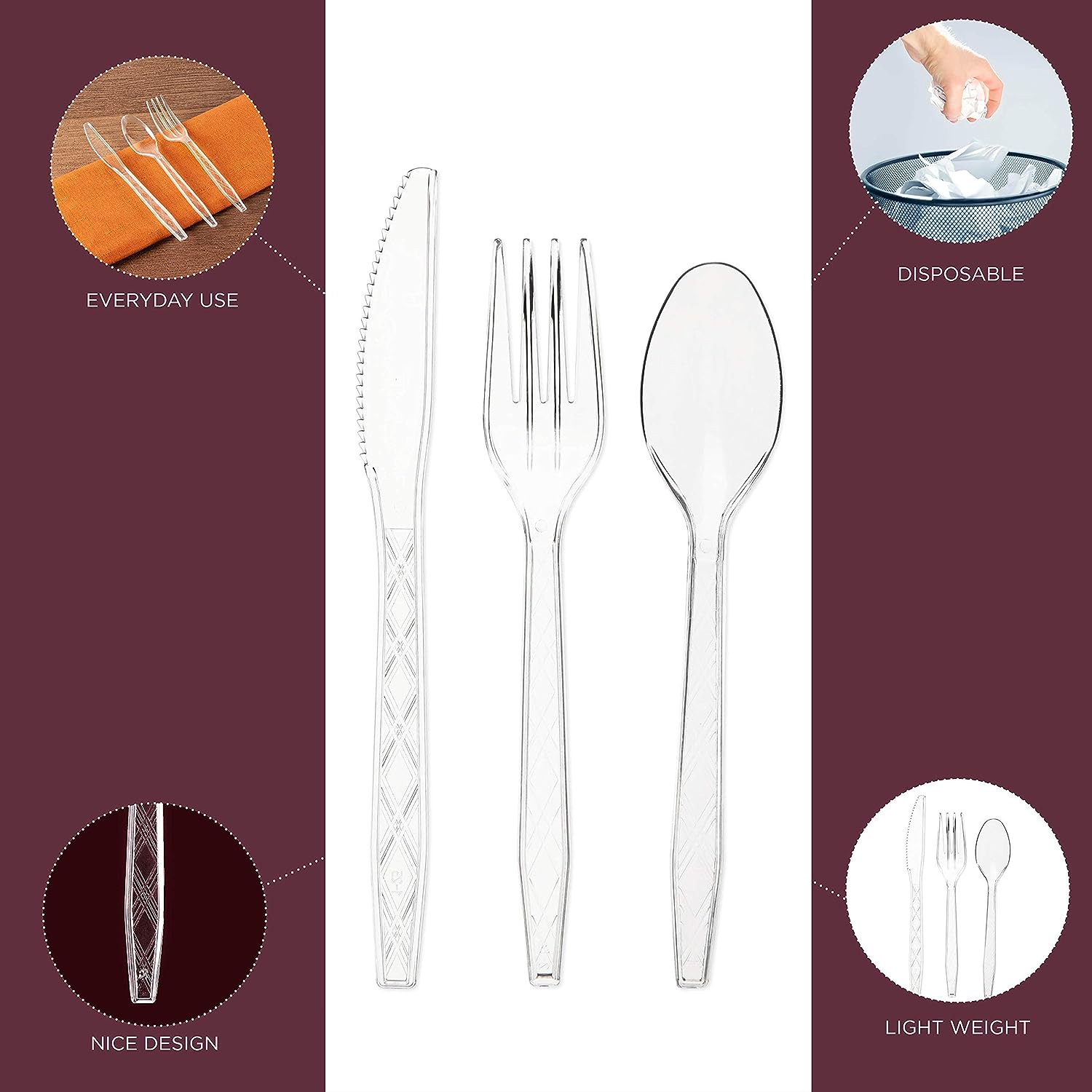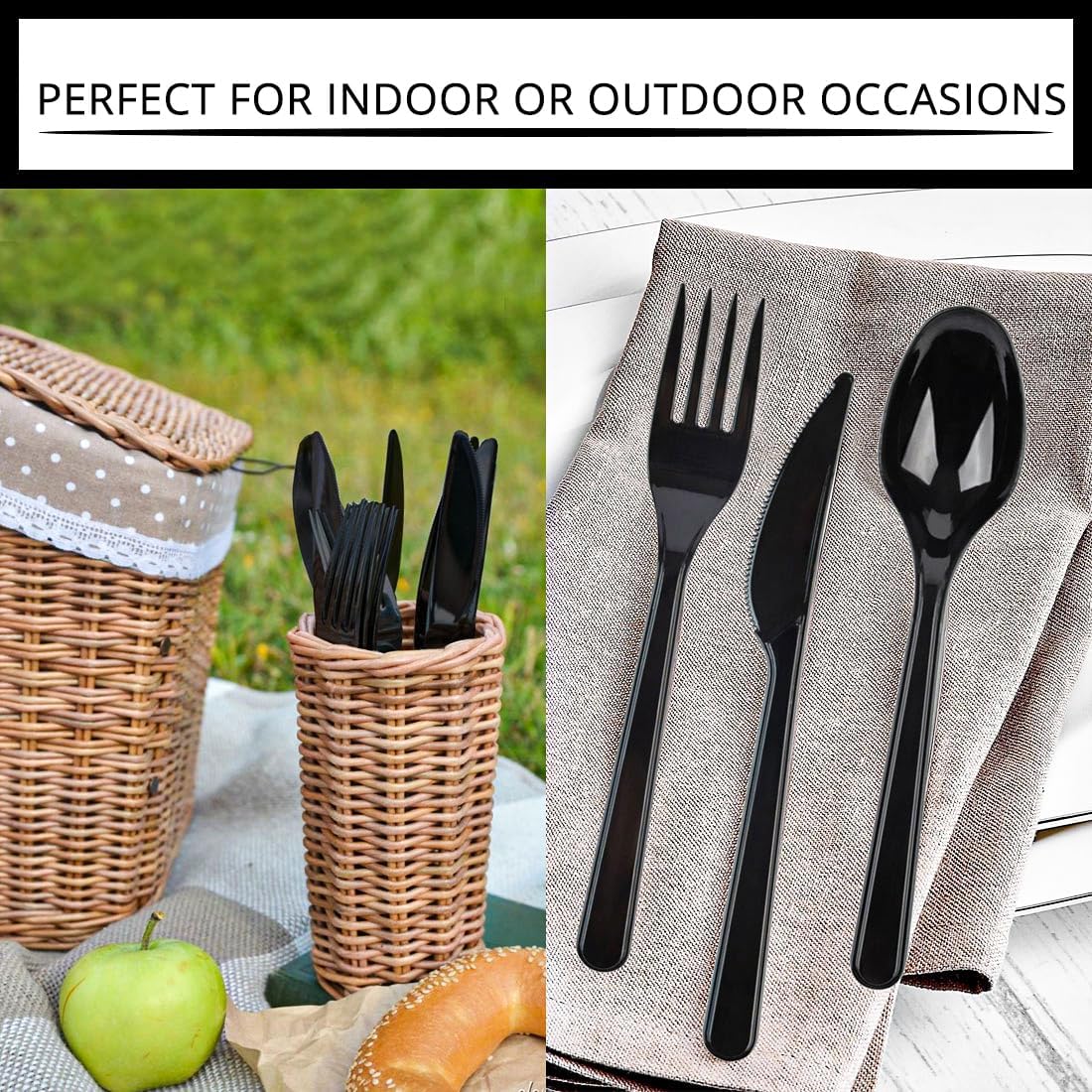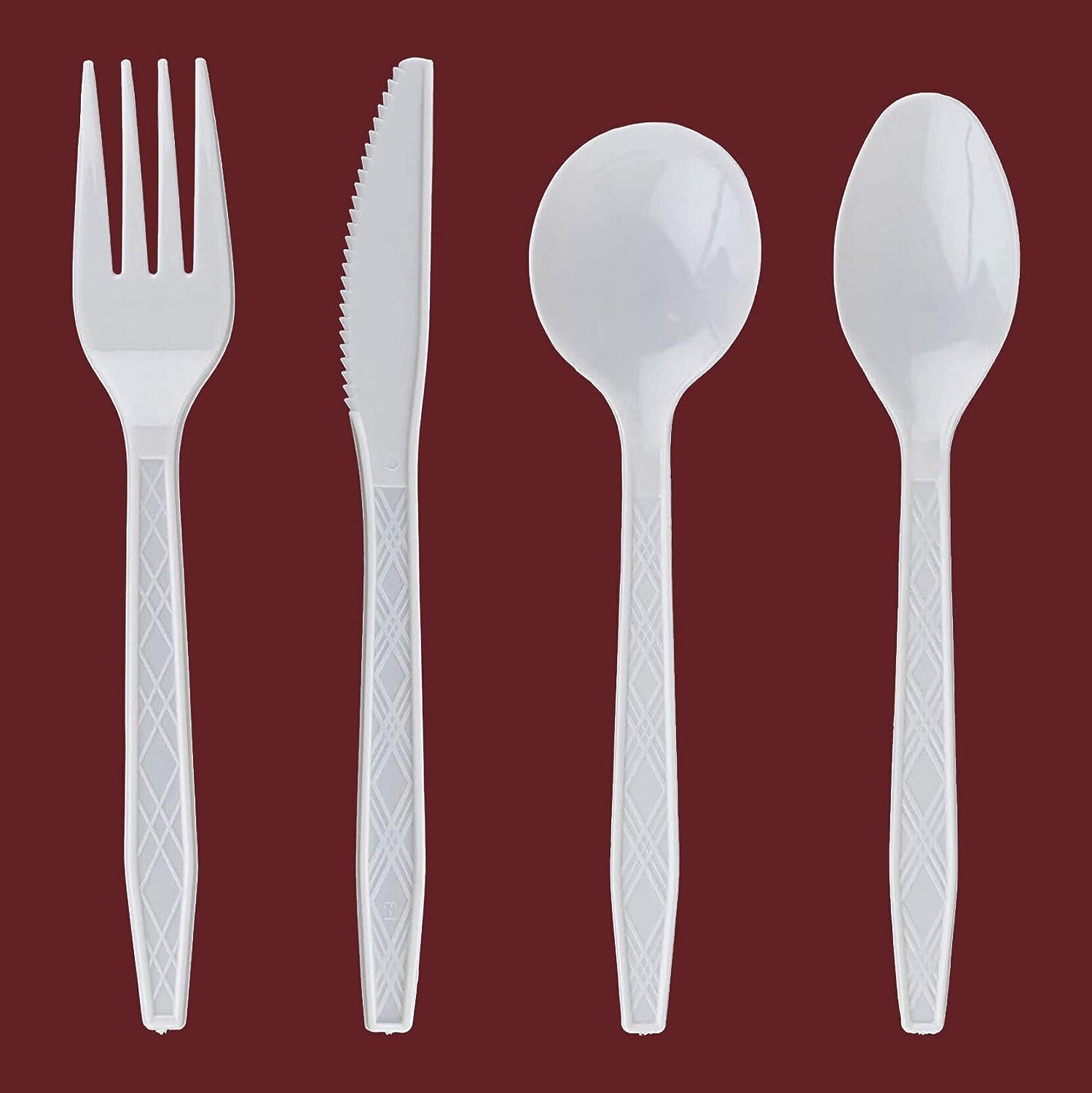 • ✅DURABLE: Heavy duty plasticware. Knives slice without breaking, strong forks spear food, spoons for hot or cold liquids.