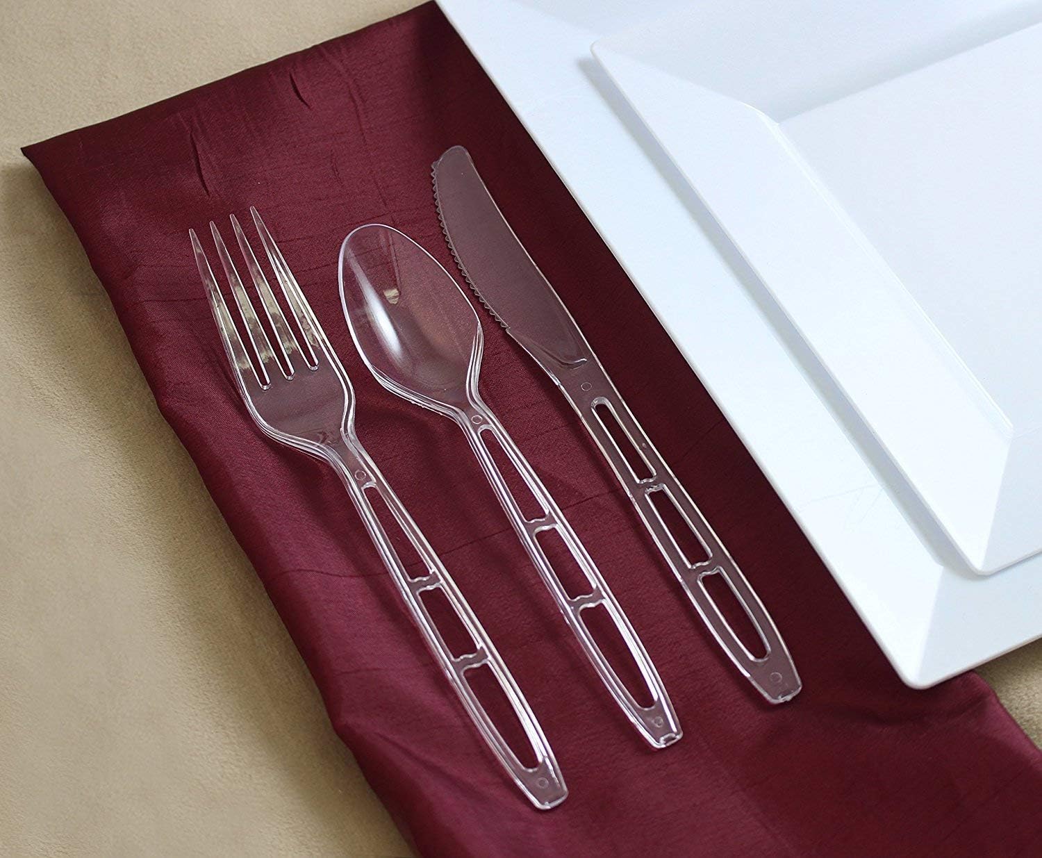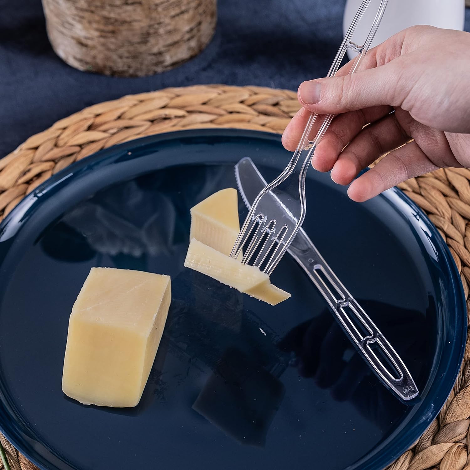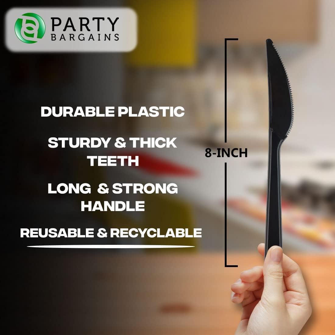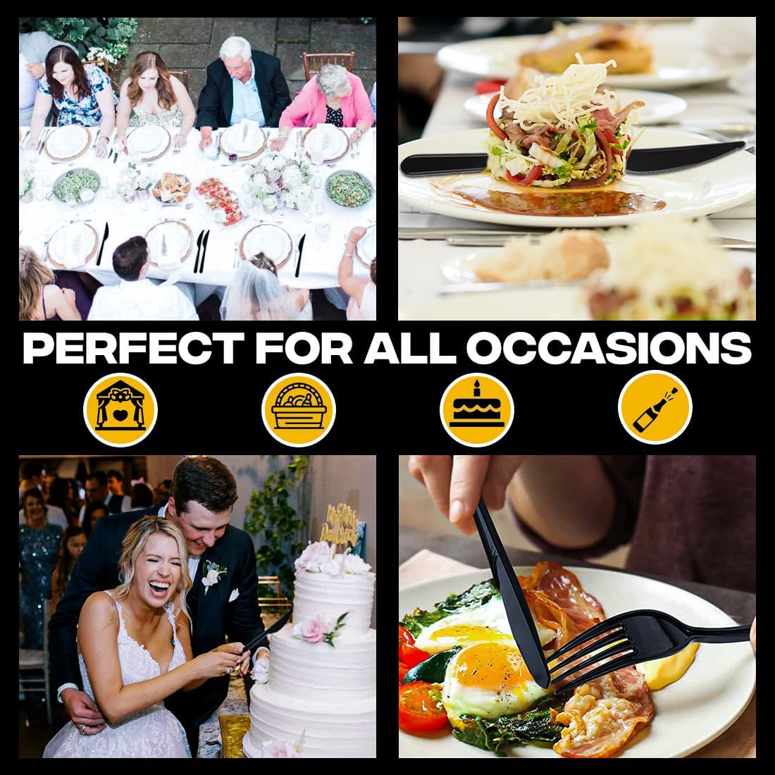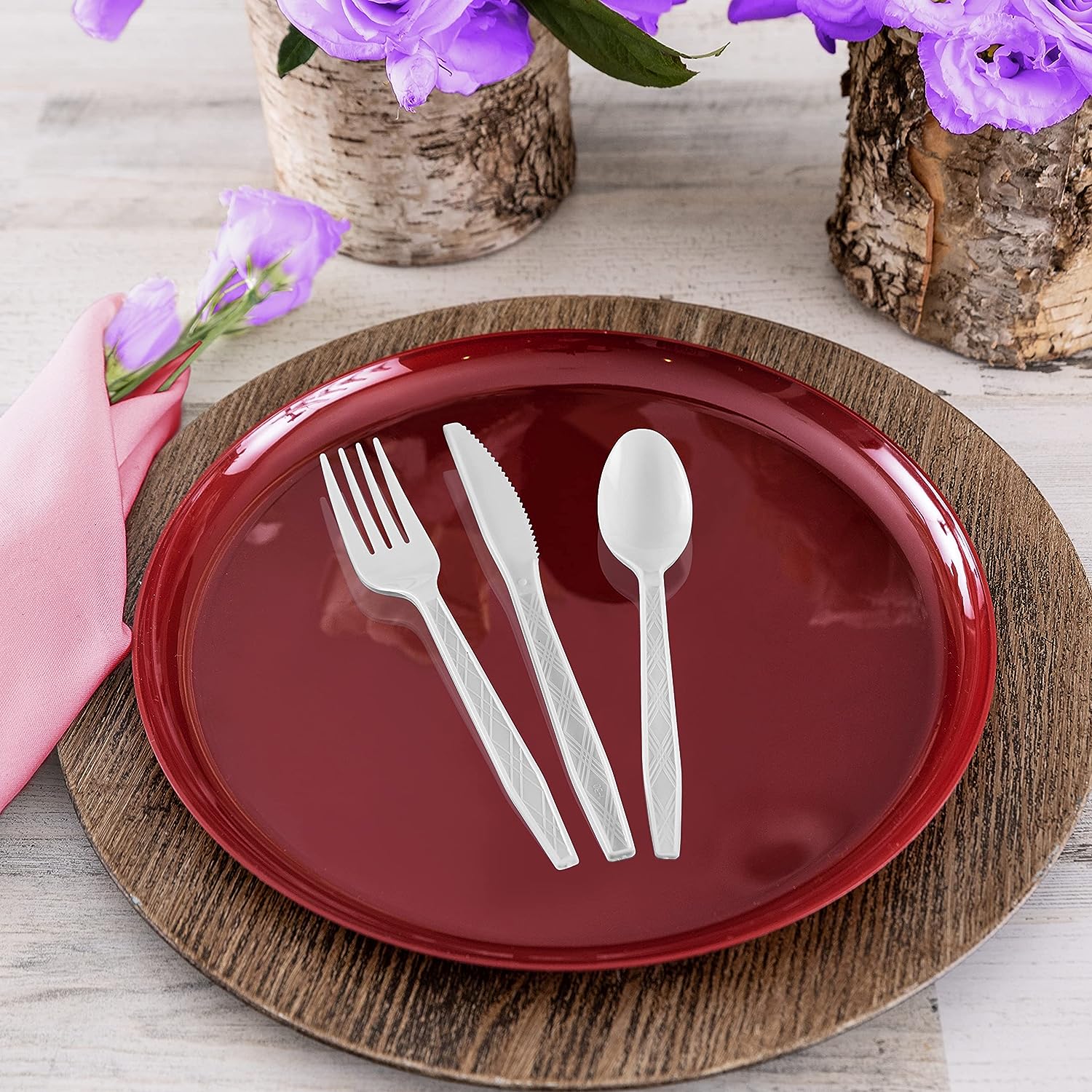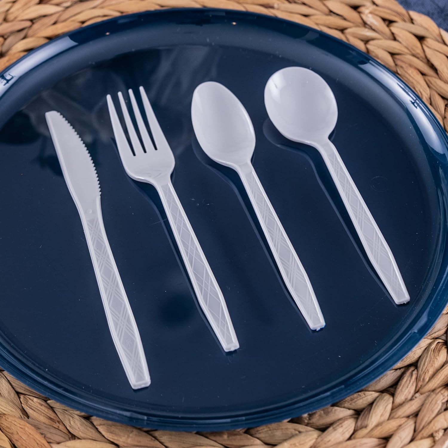 • ✅DURABLE: Heavy duty plasticware. Knives slice without breaking, strong forks spear food, spoons for hot or cold liquids.