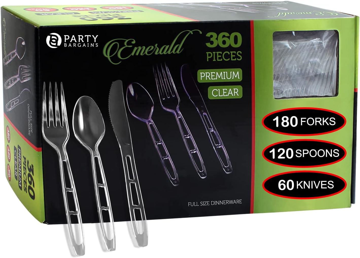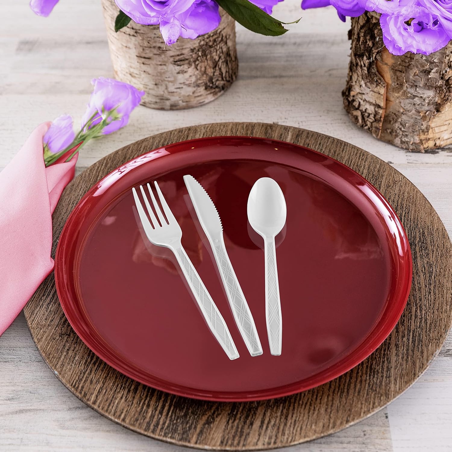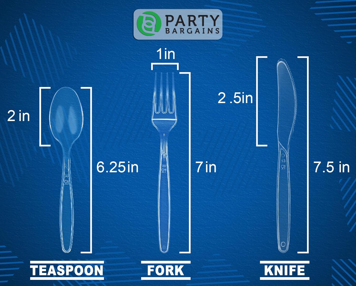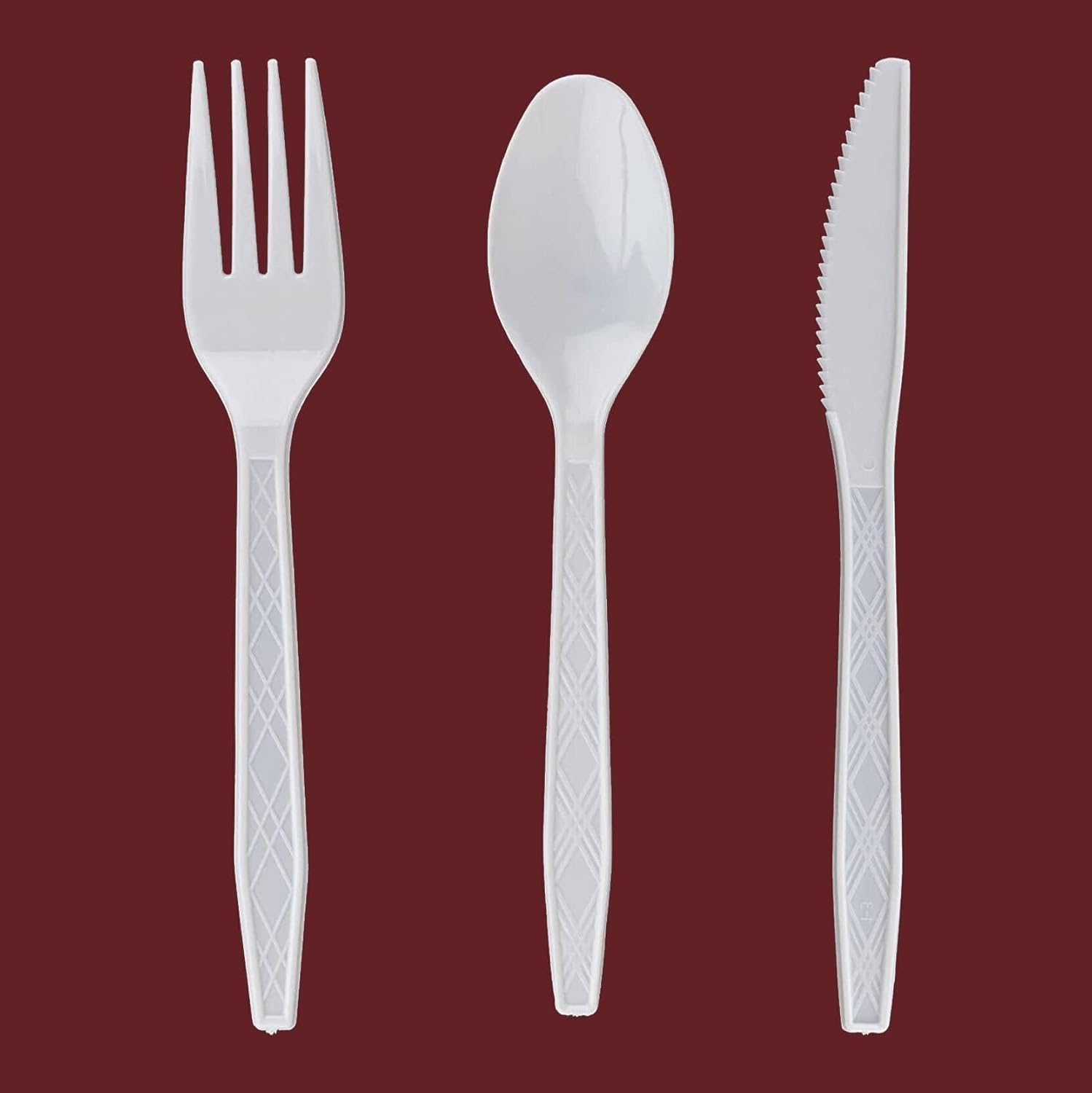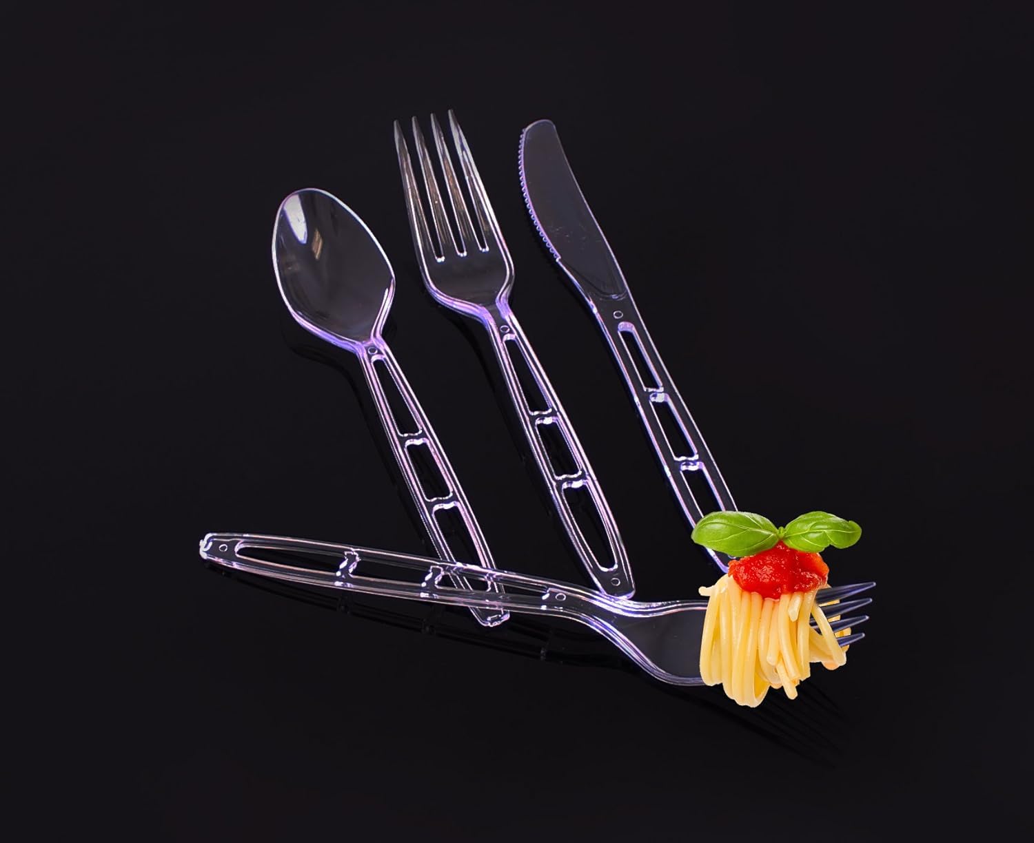 - ✅DURABLE: Heavy duty plasticware. Knives slice without breaking, strong forks spear food, spoons for hot or cold liquids.