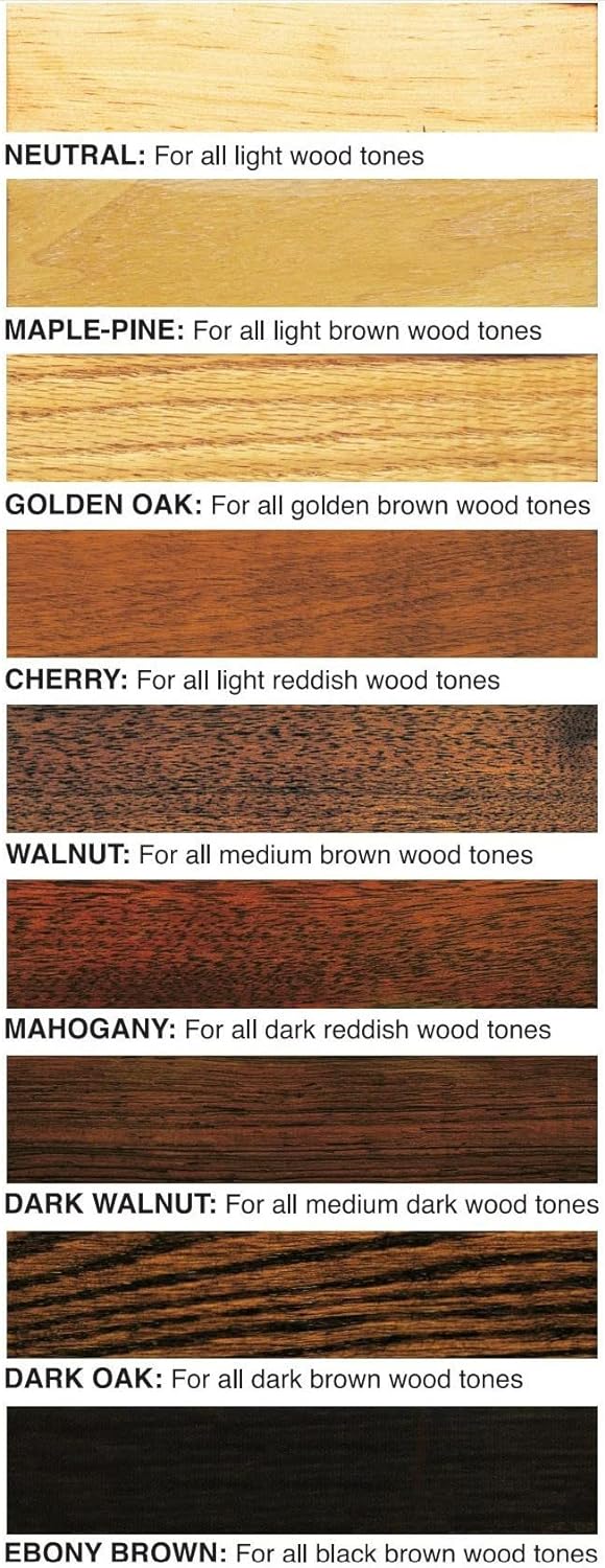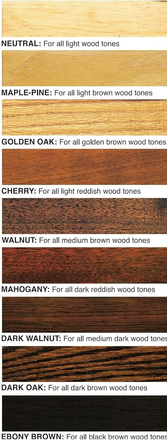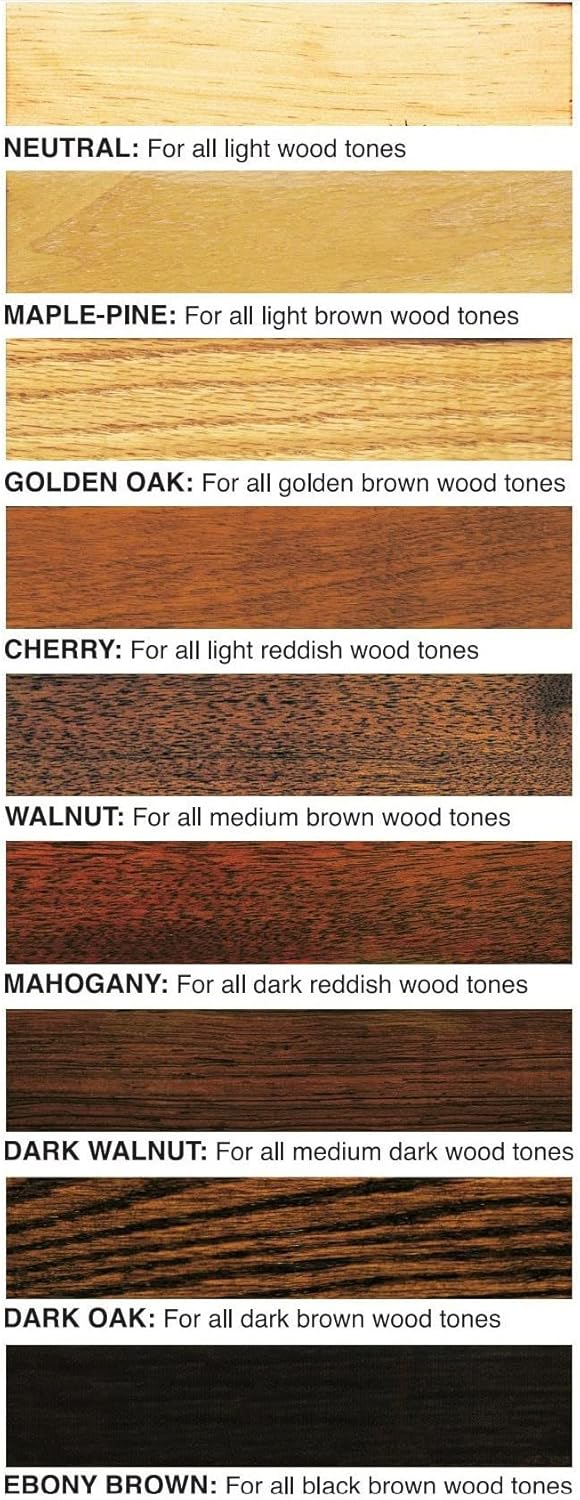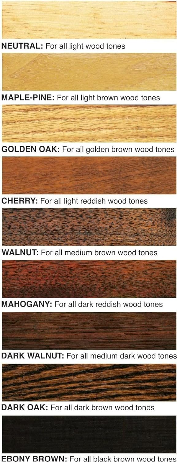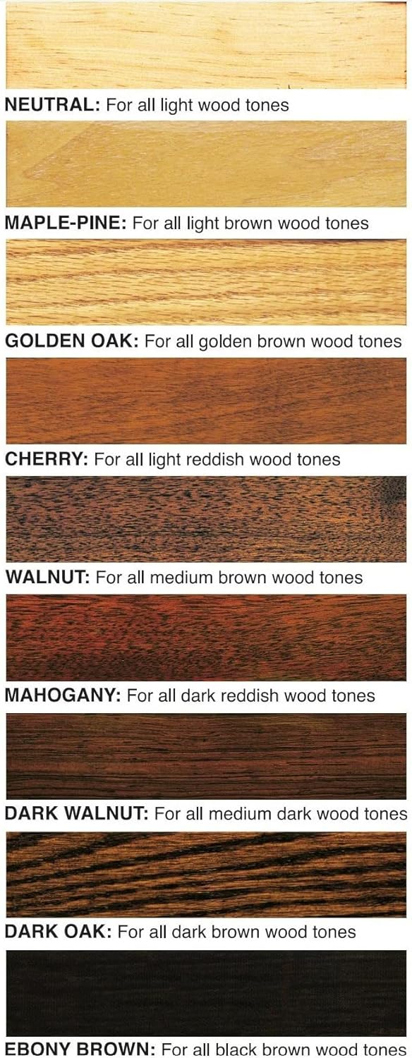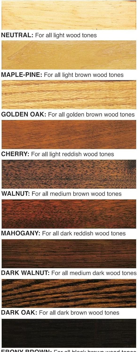 - Available in nine colors to match almost any wood finish tone; Neutral, Maple-Pine, Golden Oak, Cherry, Walnut, Mahogany, Dark Walnut, Dark Oak, and Ebony Brown