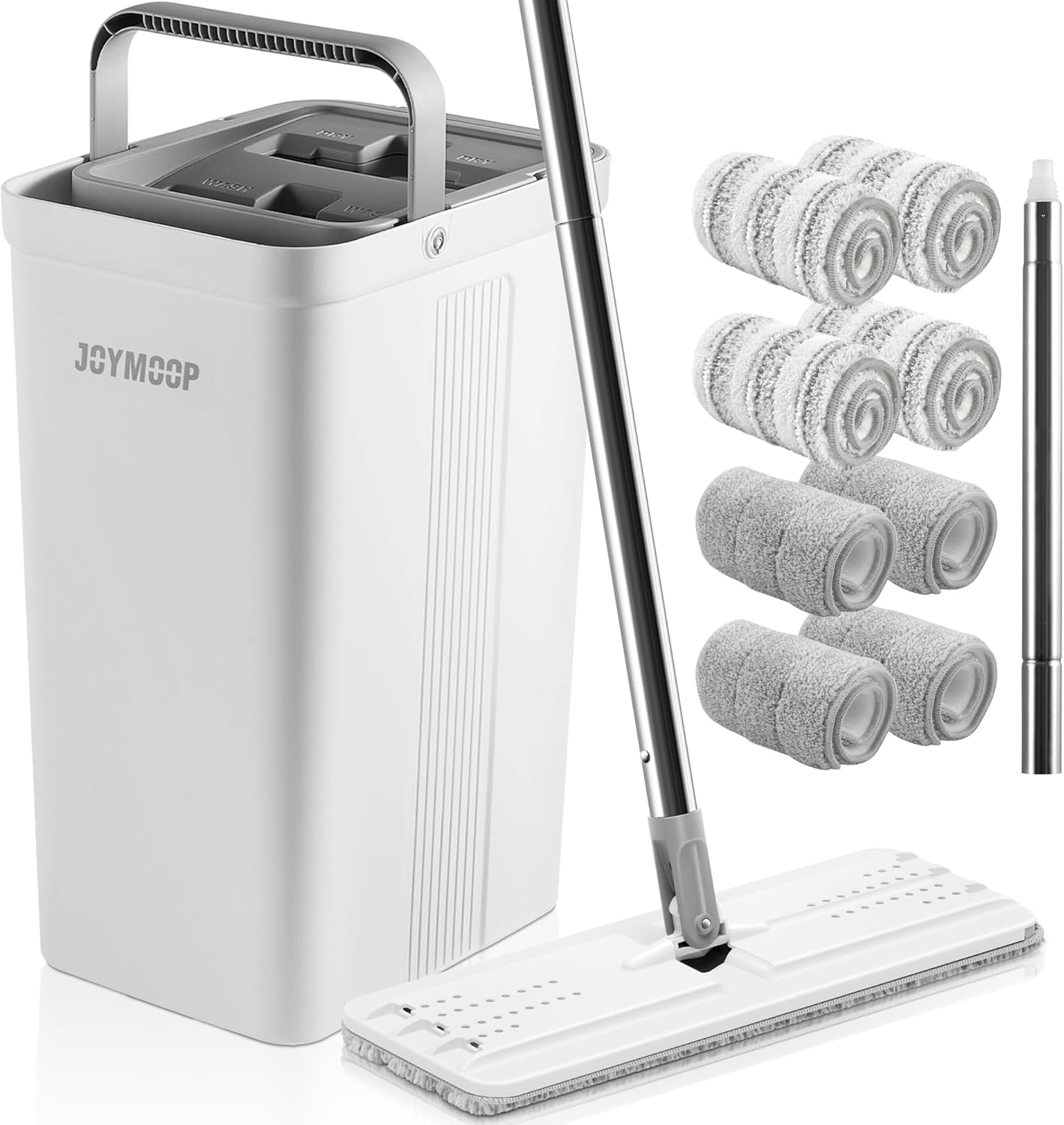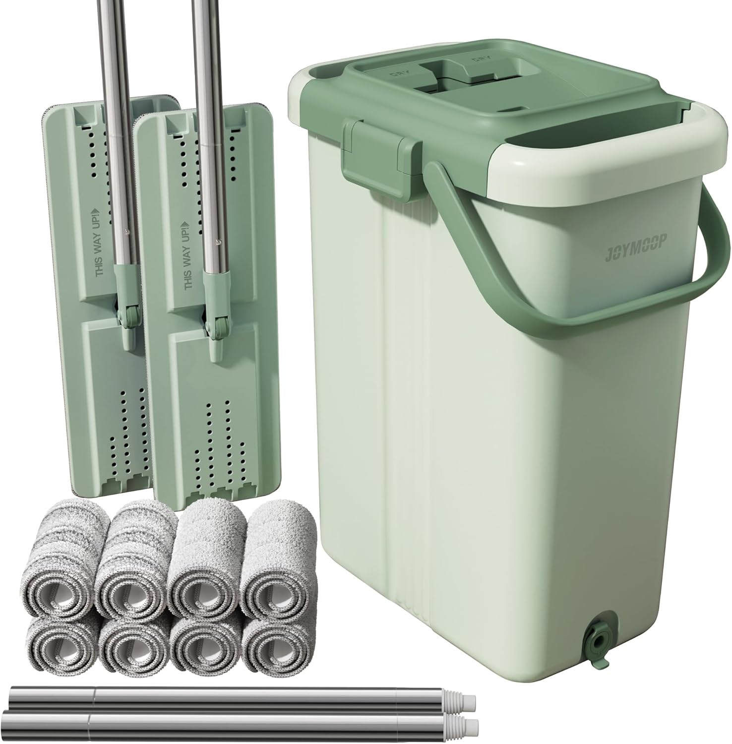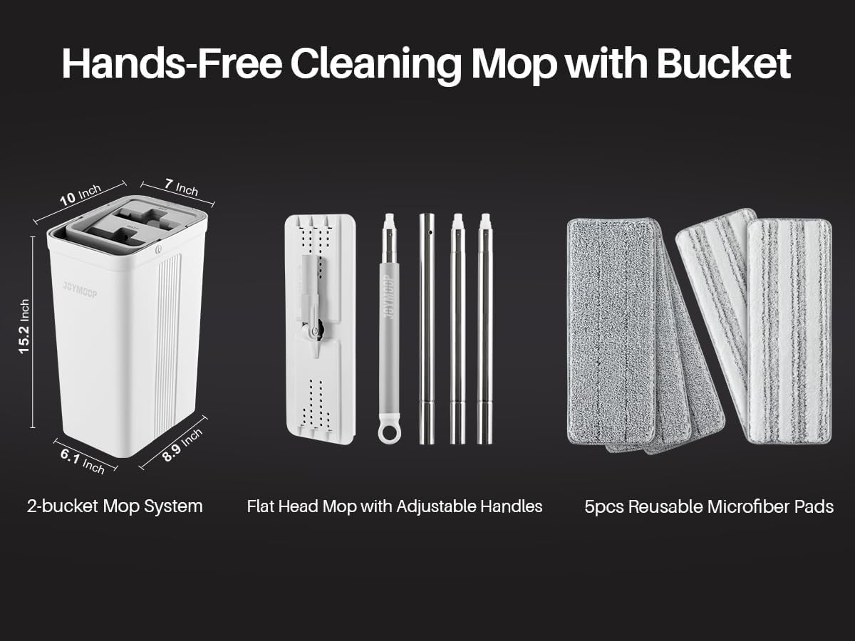 - [2-Tank Wash&Dry] JOYMOOP mop and bucket with wringer set, 2-bucket mop system, WASH and DRY, scratch dirt away in WASH chamber, squeeze out of water in DRY chamber, hands-free cleaning mop with bucket. NOTE:PLEASE WET MOP to avoid hard-insert Problem.