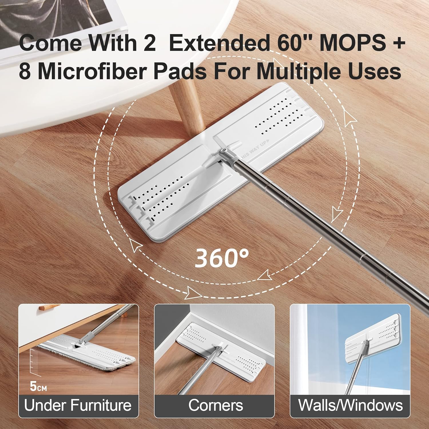 - [Corner and High?] 360° rotation flat mop-head can reach to any corners and those "under-the-whatever" places. The adjustable Stainless Steel Handle can be extended from 26.5 to 60.9 inches, much suitable to be a Wet Dry Mop for walls, Wall Cleaner with Long Handle.