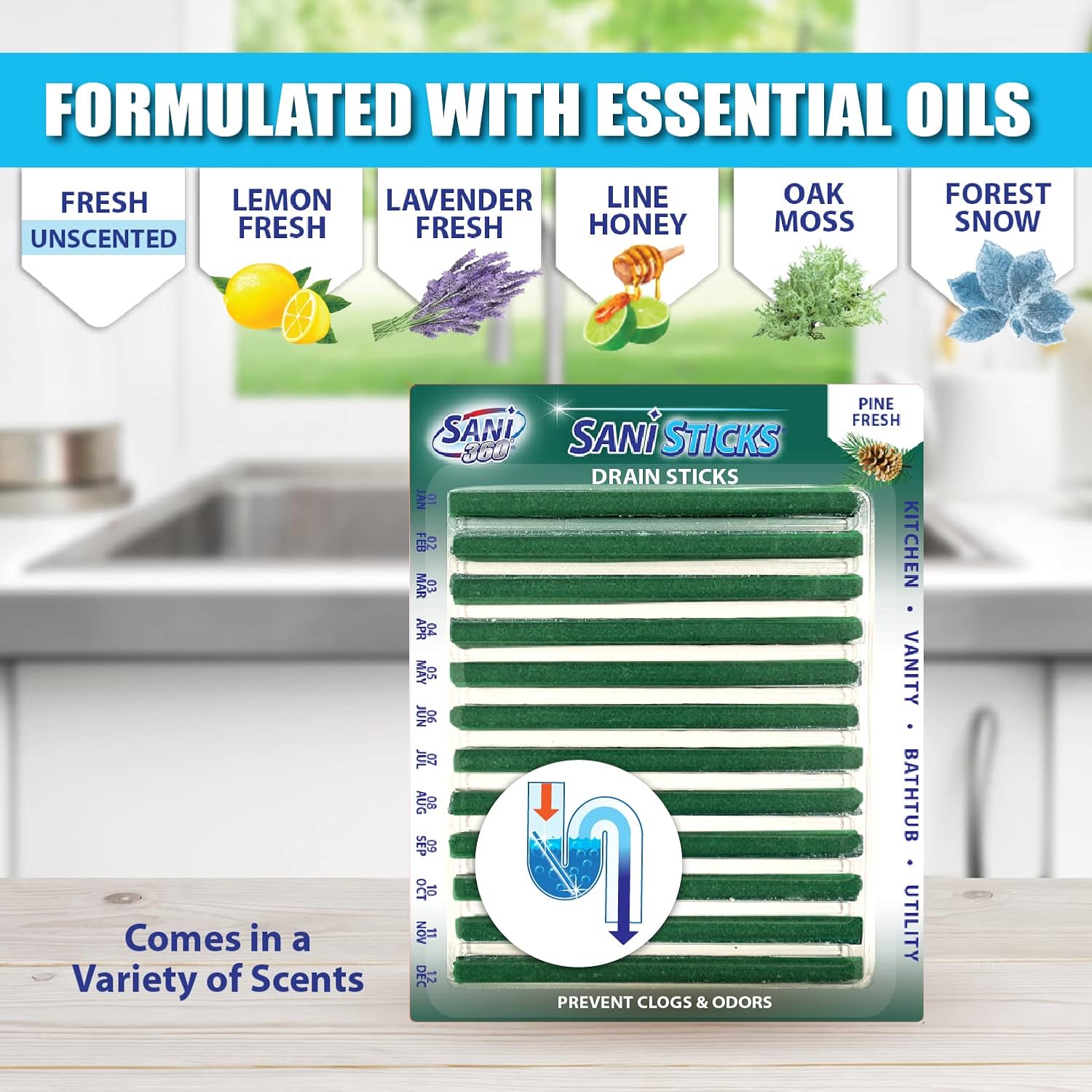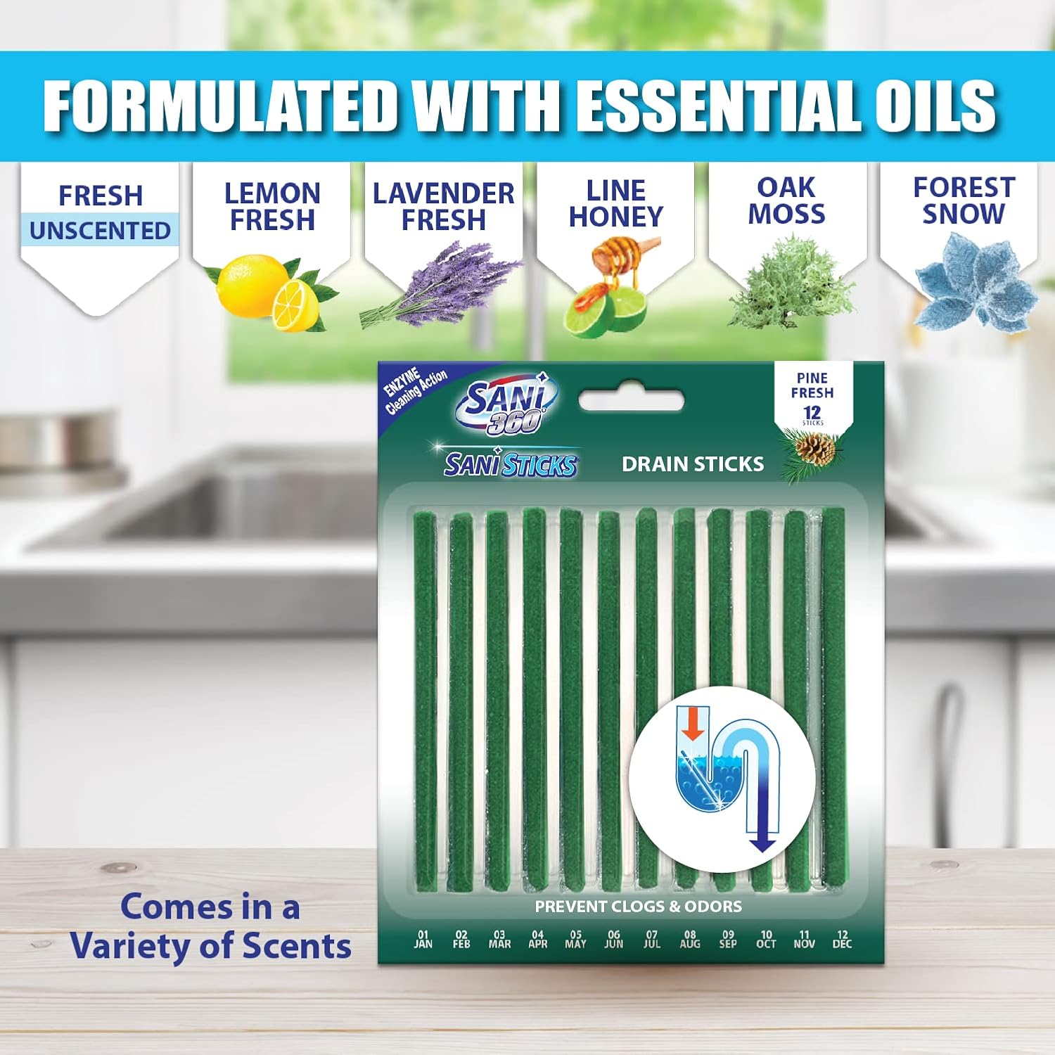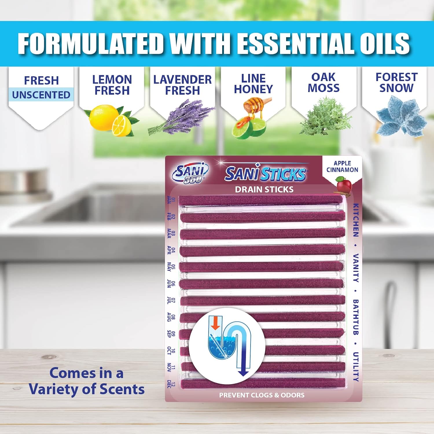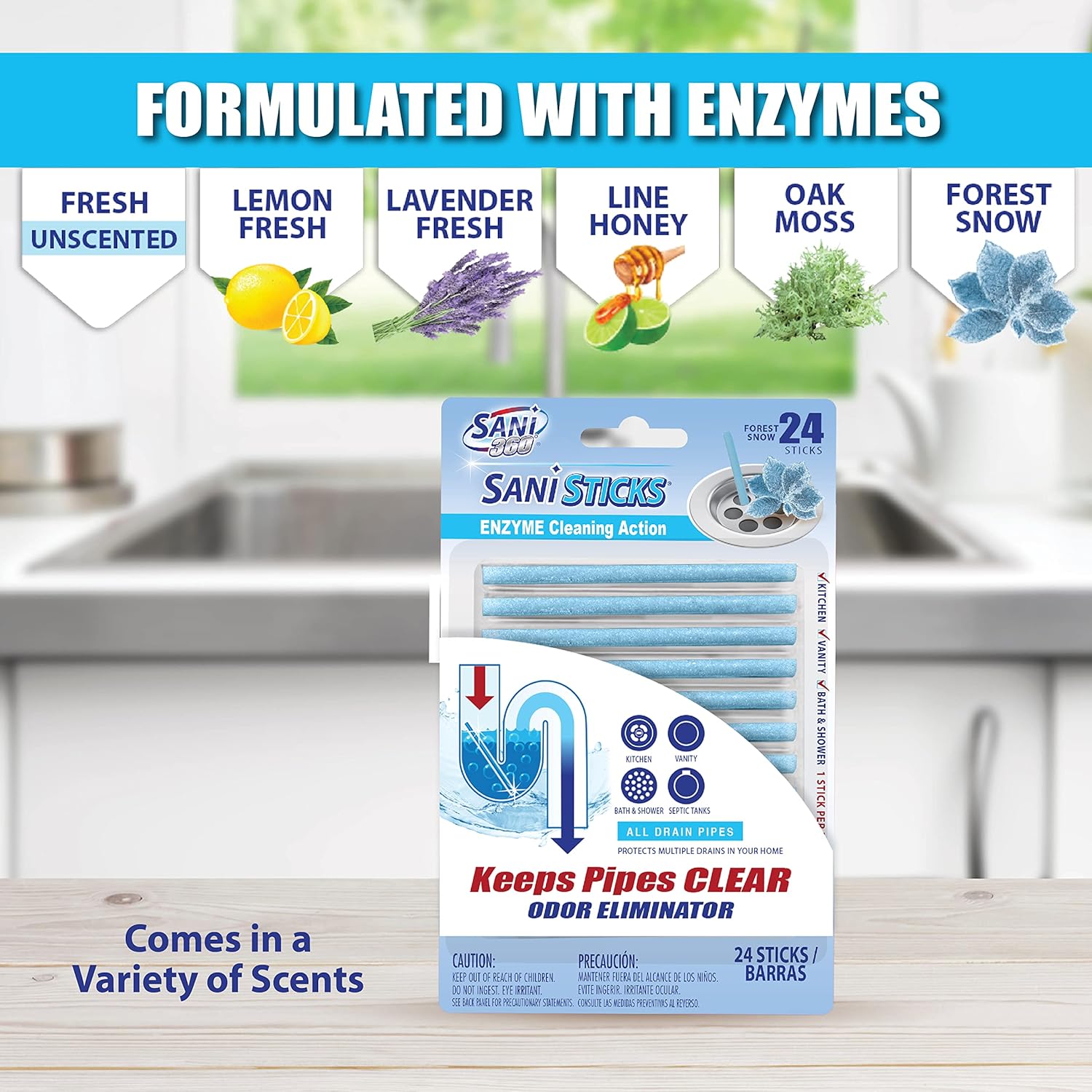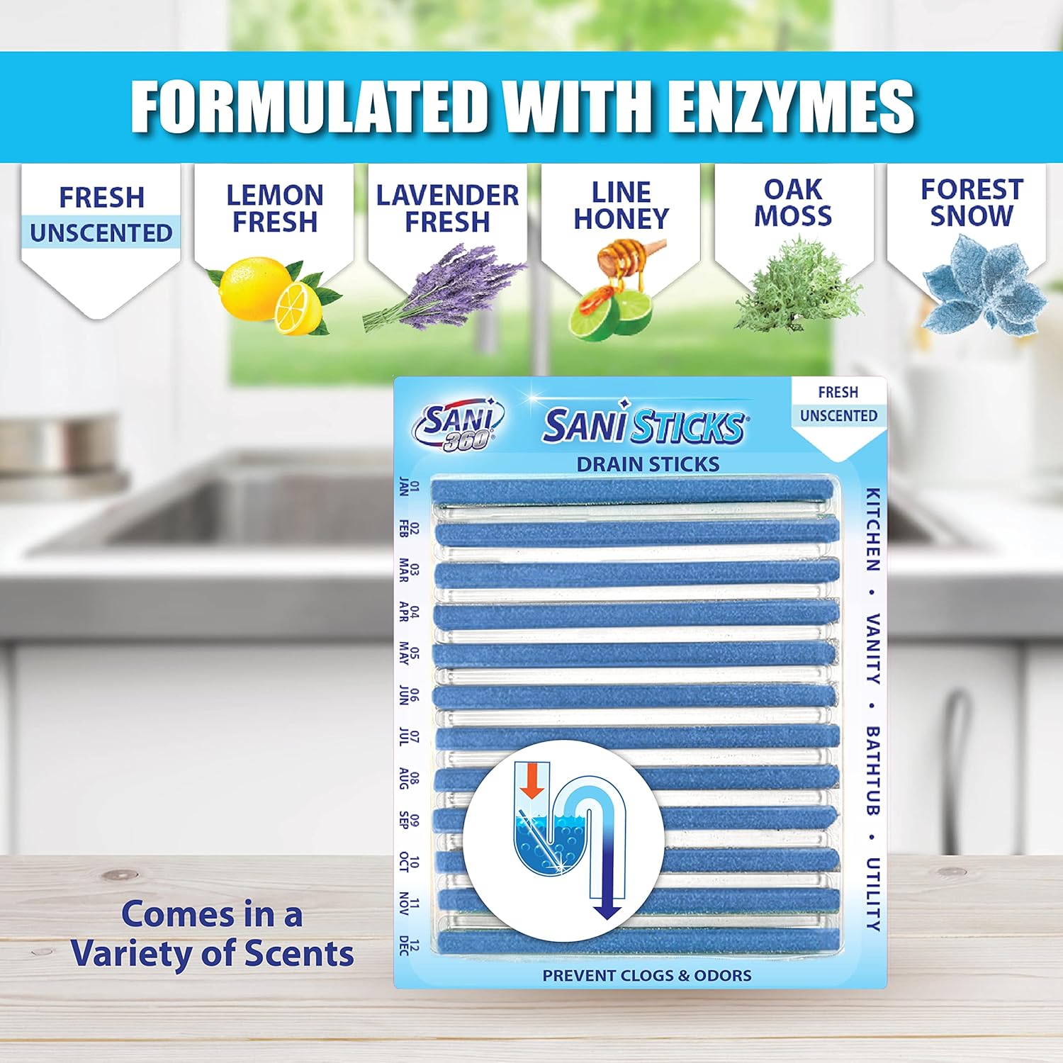 - SAFE TO USE IN ALL DRAINS: Sani Sticks fresh unscented odor-eliminating sink-cleaner sticks only use enzymes to clean, so they’re safe for use in all drains, from the bathroom to the kitchen. Keep your drains safer and smelling fresher with this drain and odor-remover monthly treatment. Sani Sticks are available in many fresh scents, including lemon, lavender, lime honey, orange, pine, apple cinnamon, oak moss, and forest snow.