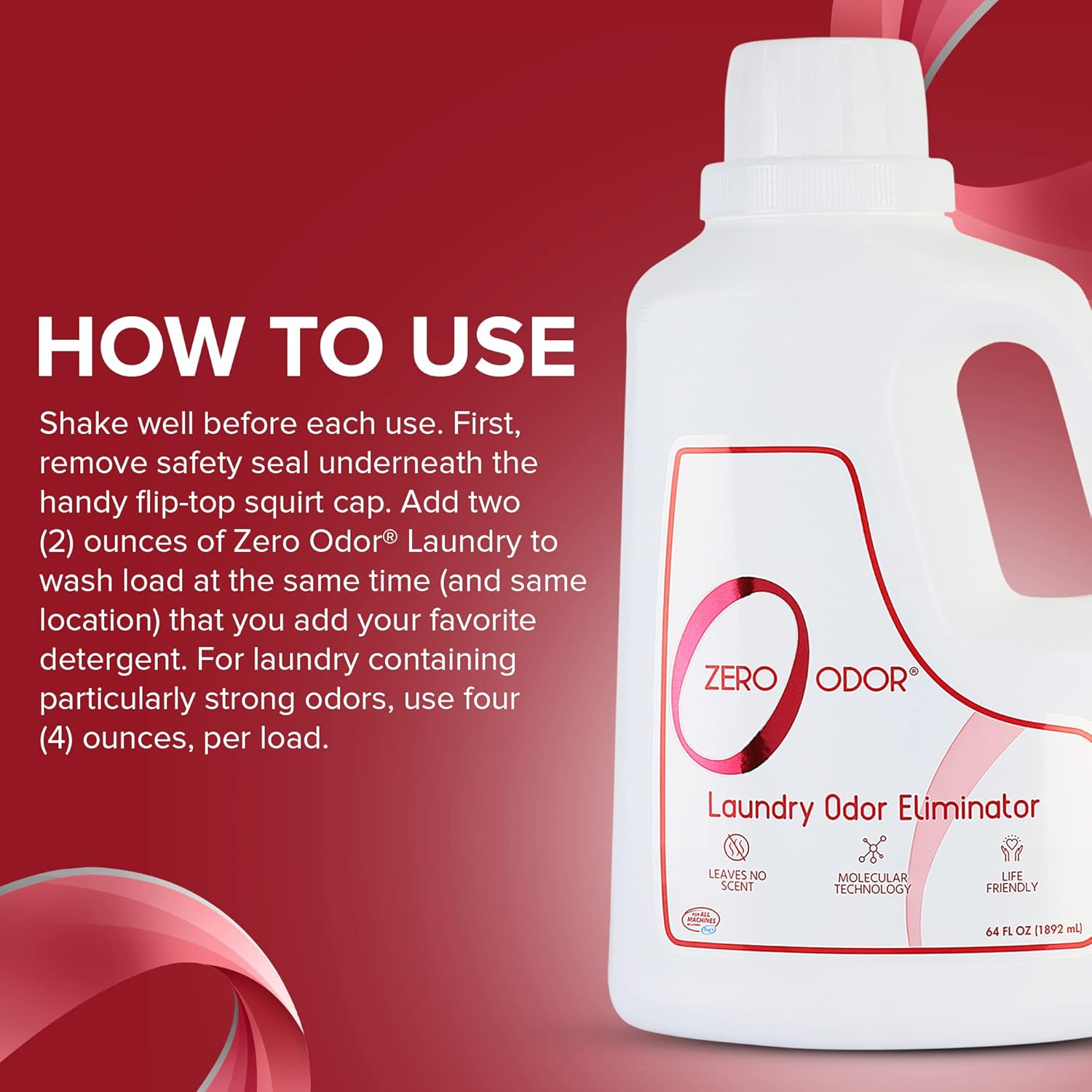 - How To Use: Add two (2) ounces of Zero Odor Laundry to wash load at the same time (and same location) that you add your favorite detergent.