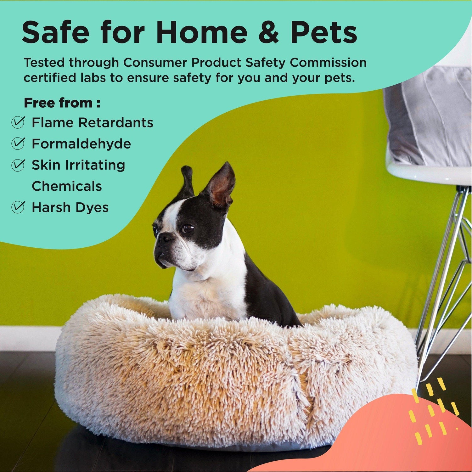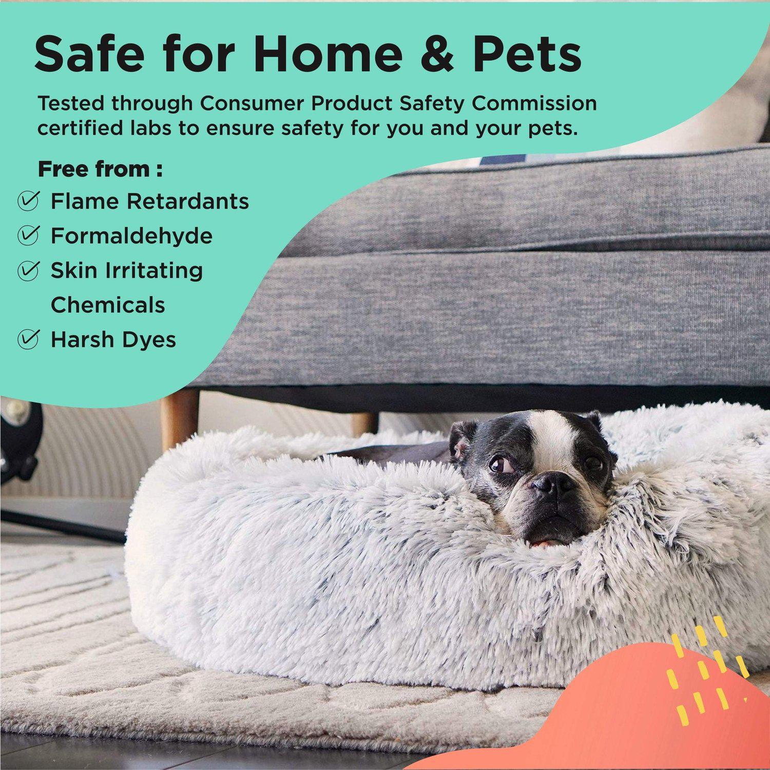PET-SAFE MATERIALS: Our fluffy dog bed is made with durable vegan polyester and filled with AirLoft fibers. The fibers consist of premium white poly filling that keeps its loft for up to 3Xs longer than most standard fluffy pet beds.