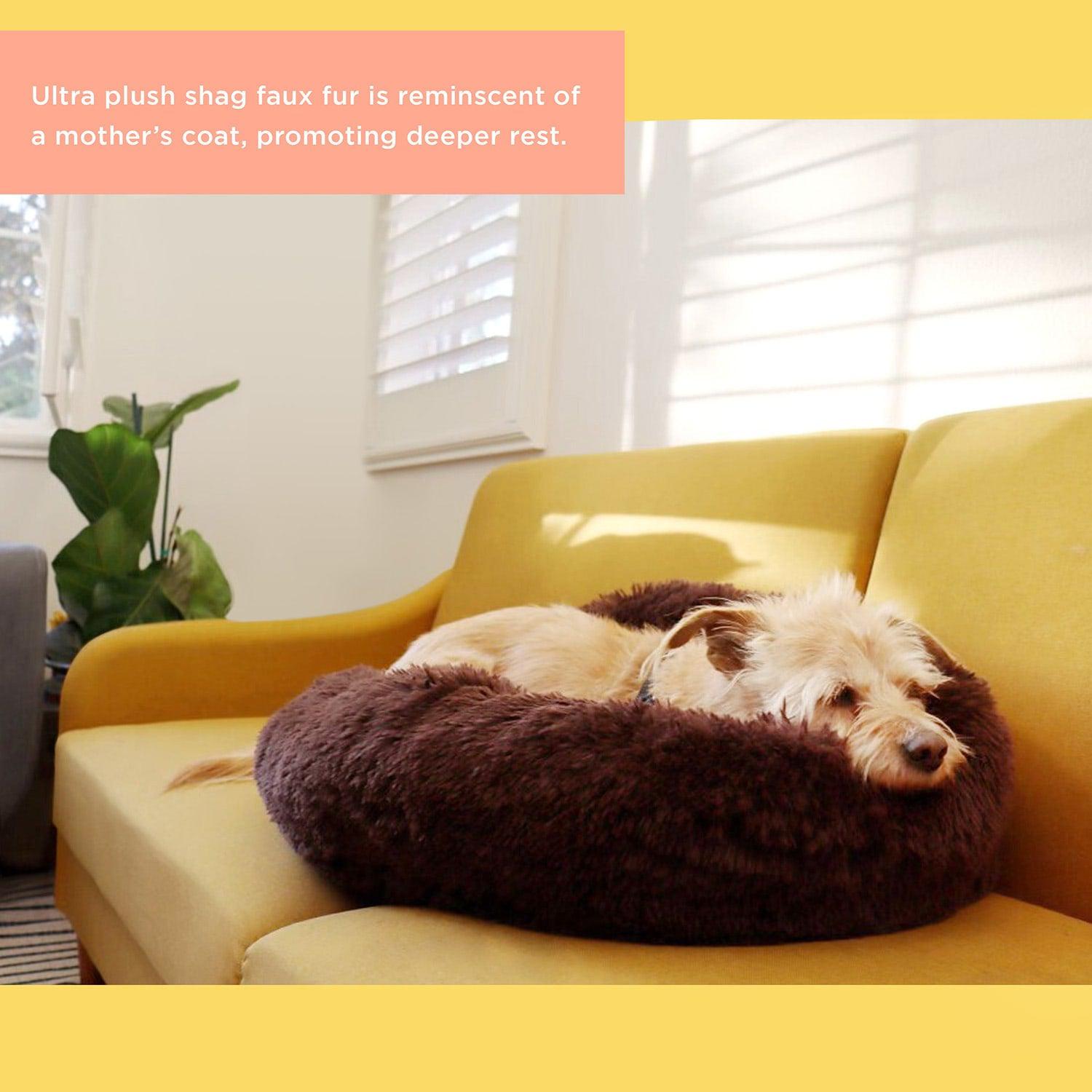 SUPERIOR COMFORT: Cozy, flexible, and finished with vegan shag fur, our self-warming, soothing plush dog bed is reminiscent of a mother’s fur coat! Paired with deep crevices that allow your pet to burrow, animals will have full, restful sleep for improved behavior and better health.
