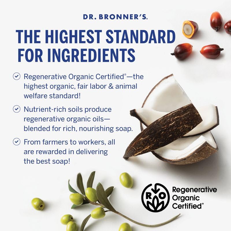 - MADE WITH ORGANIC OILS & CERTIFIED FAIR TRADE INGREDIENTS: Dr. Bronner's Pure-Castile Liquid Soaps are made with over 70% certified organic & fair trade ingredients, promoting healthy communities, ethical working conditions & fair prices.