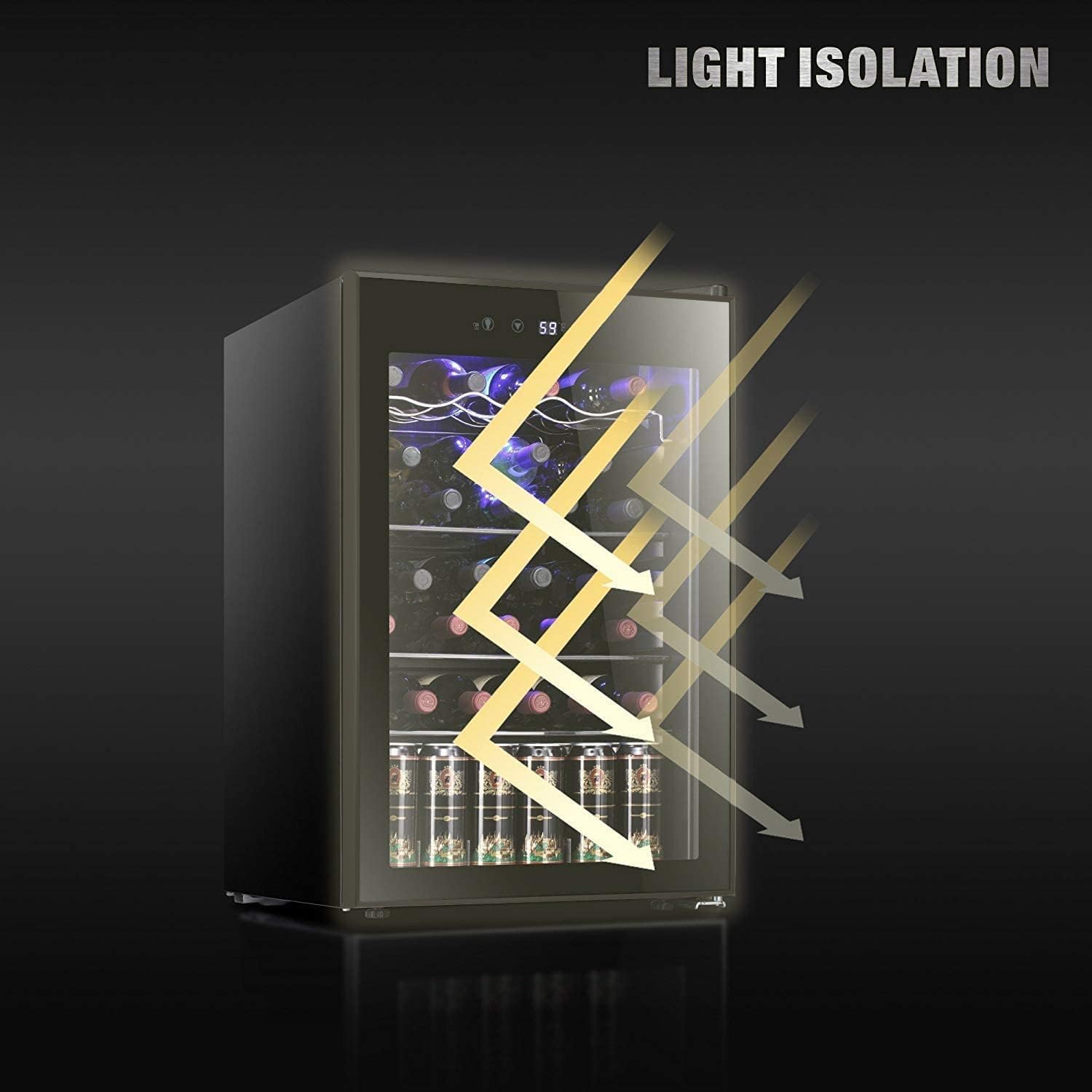 • IDEAL LIGHT and HUMIDITY: The reinforced glass door with air tight seal helps to maintain an ideal humidity level, this beverage refrigerator gives you a compact and modern sensation. Perfect for your living room. Blue soft LED interior lighting not only beautifully showcases the wine but won’t damage the wine.