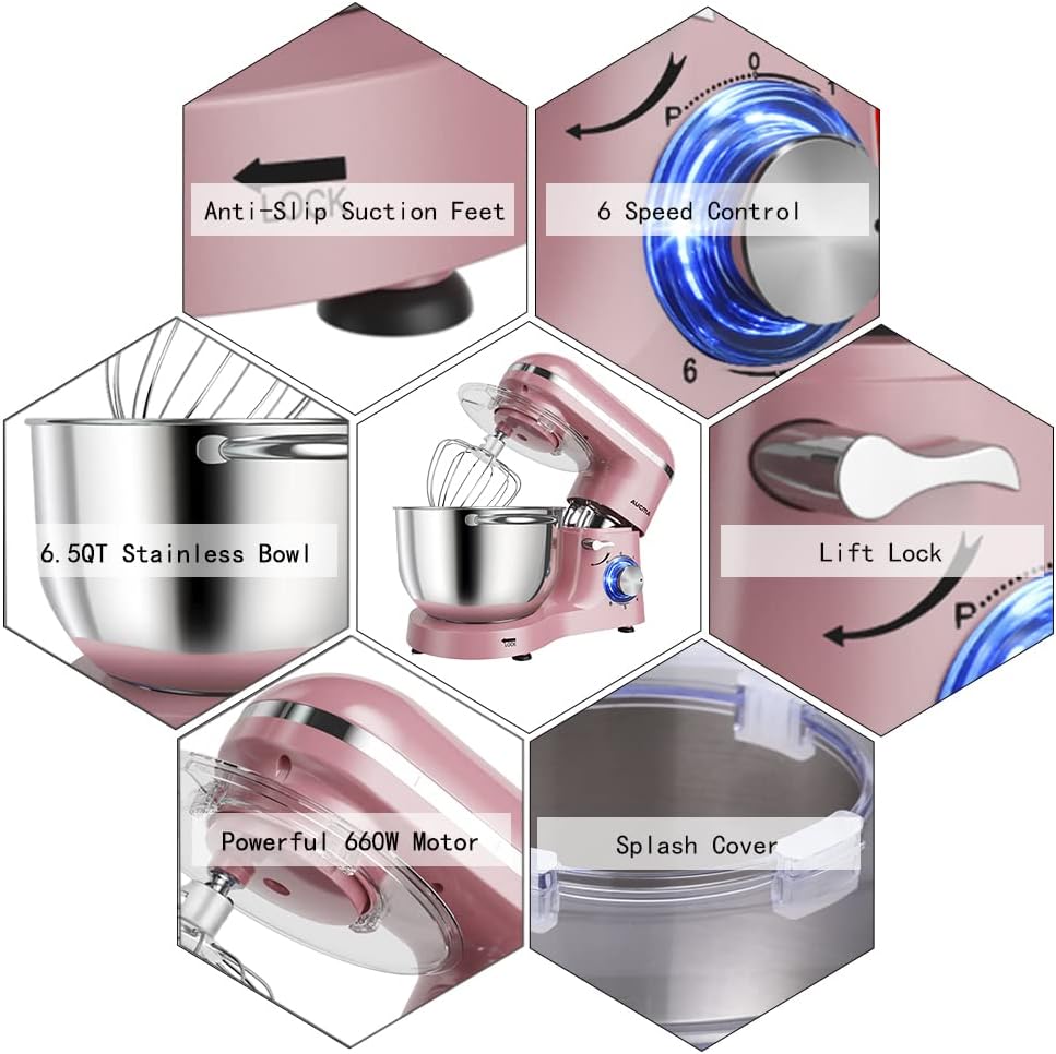 - Multiple Attachment Set - Aucma stand mixer comes with three mixing accessories: whisk, dough hook, mixing beater.The splash guard with access hatch helps add ingredients without making a mess.