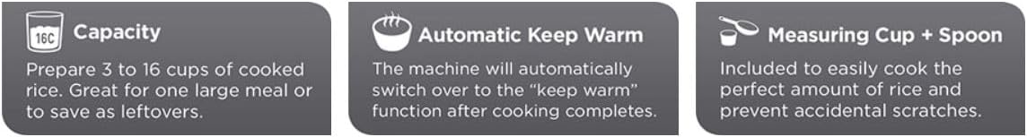 - Automatic Keep Warm - The rice stays ready for serving! The rice cooker automatically switches to the “keep warm” function after cooking is complete. Steamer Basket, Measuring Cup and Spoon Included
