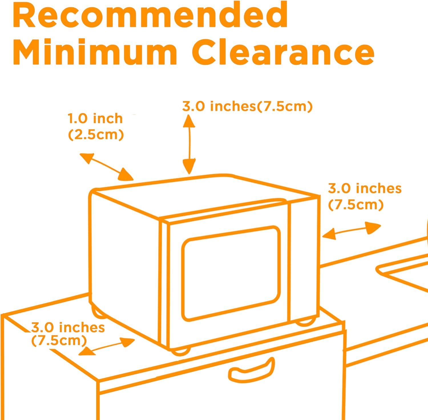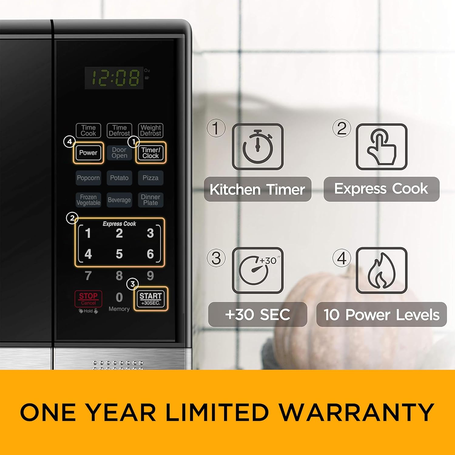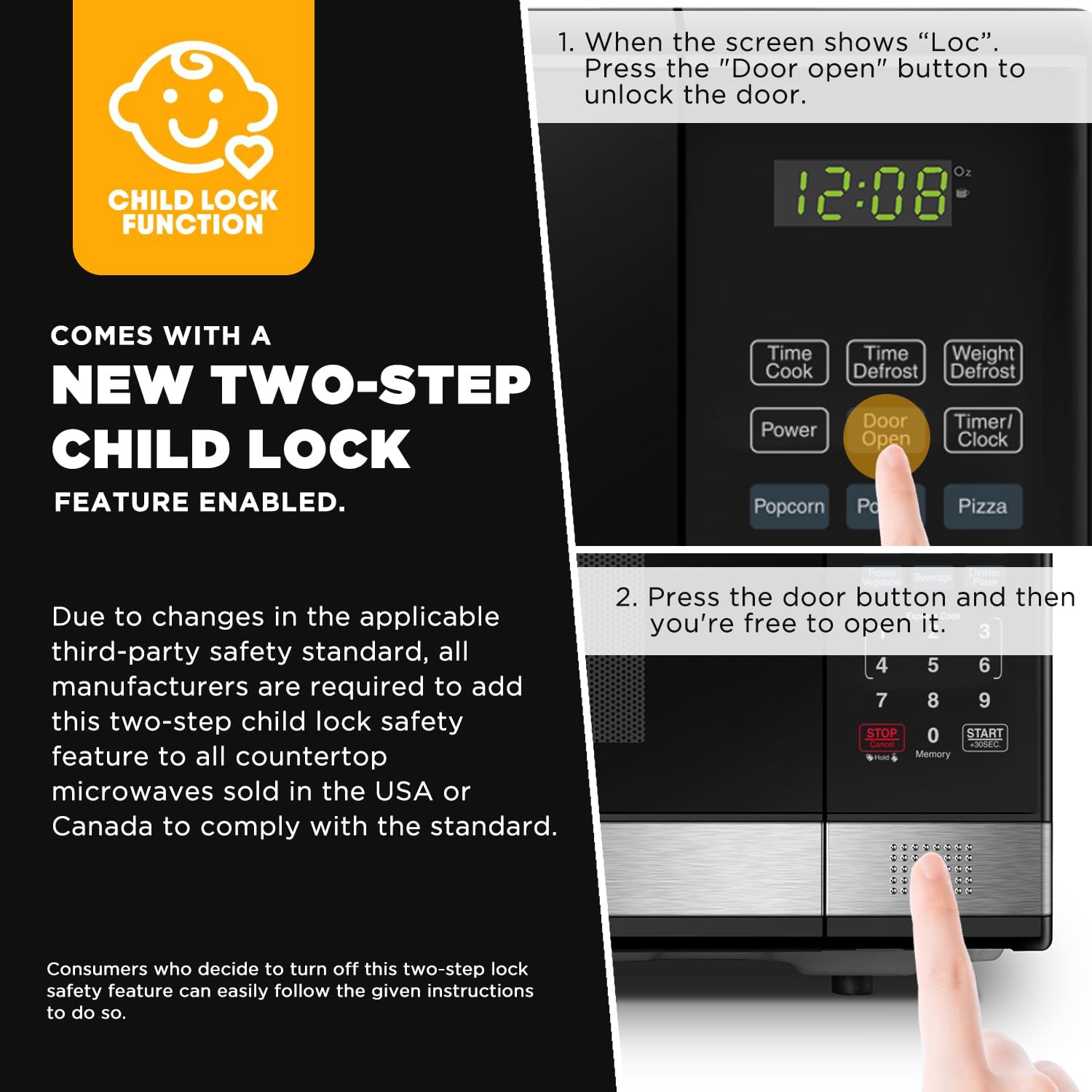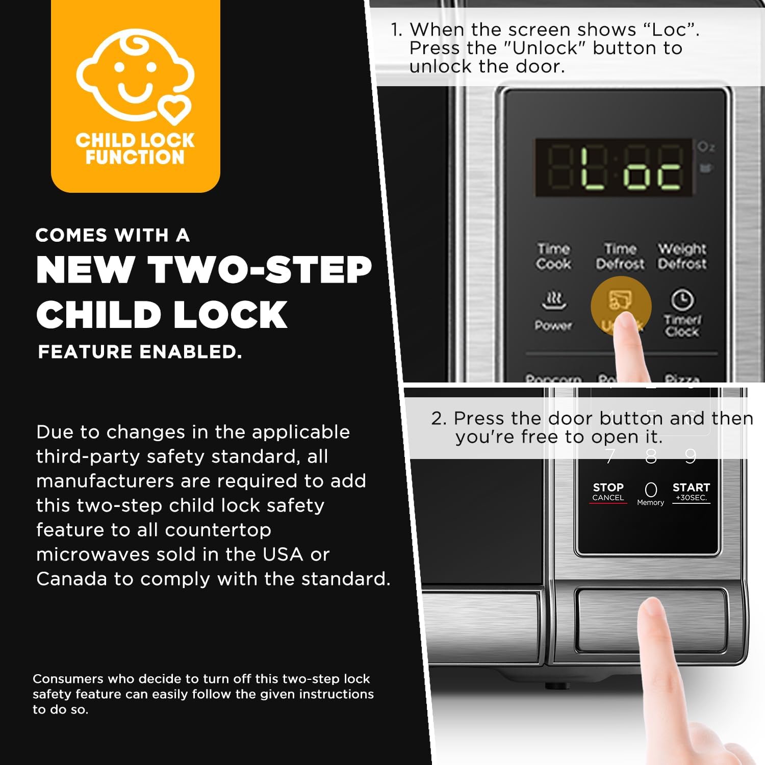 - Large LED digital display, easy-to-read control panel, child safety lock, interior light, removable 10” glass turntable