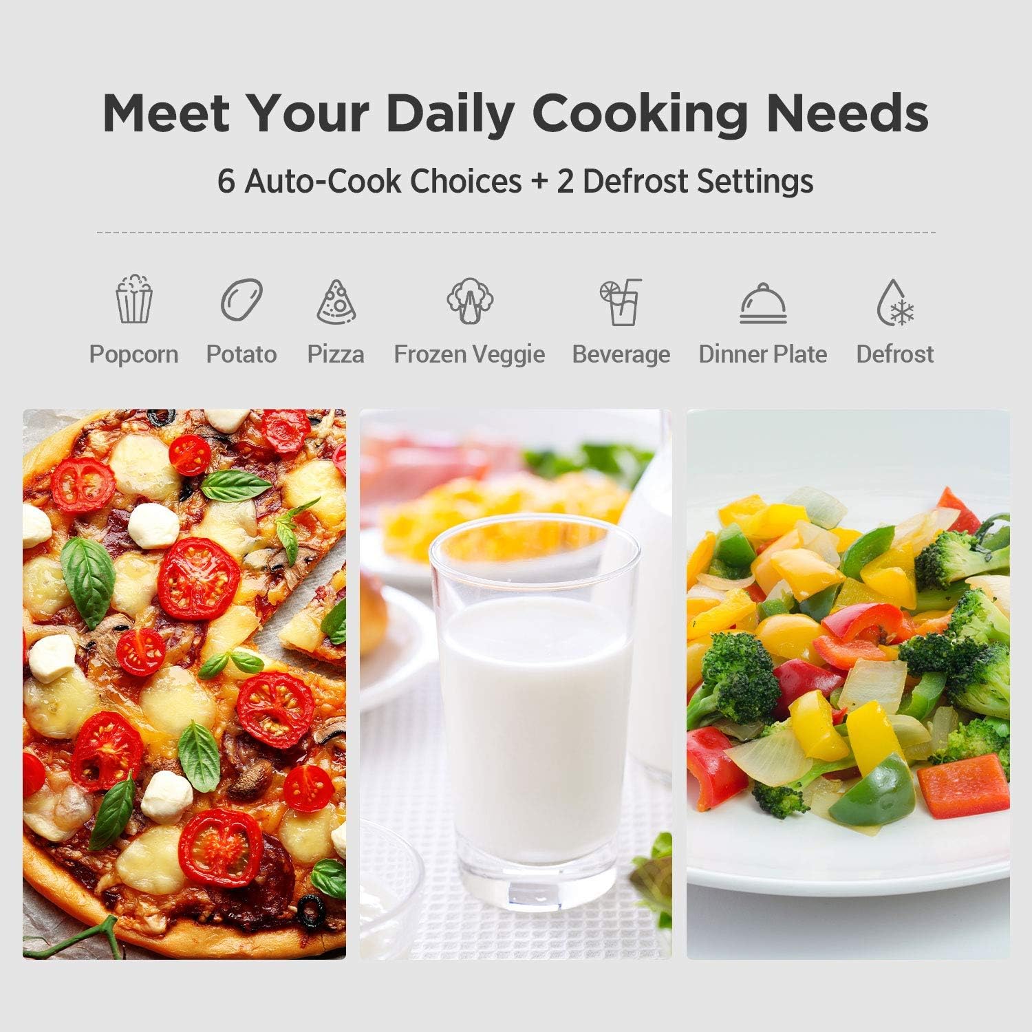 • Mute function, settings, clock, kitchen timer, child safety lock, easy auto-cook functions: Popcorn, potato, pizza, frozen veggie, beverage, reheat