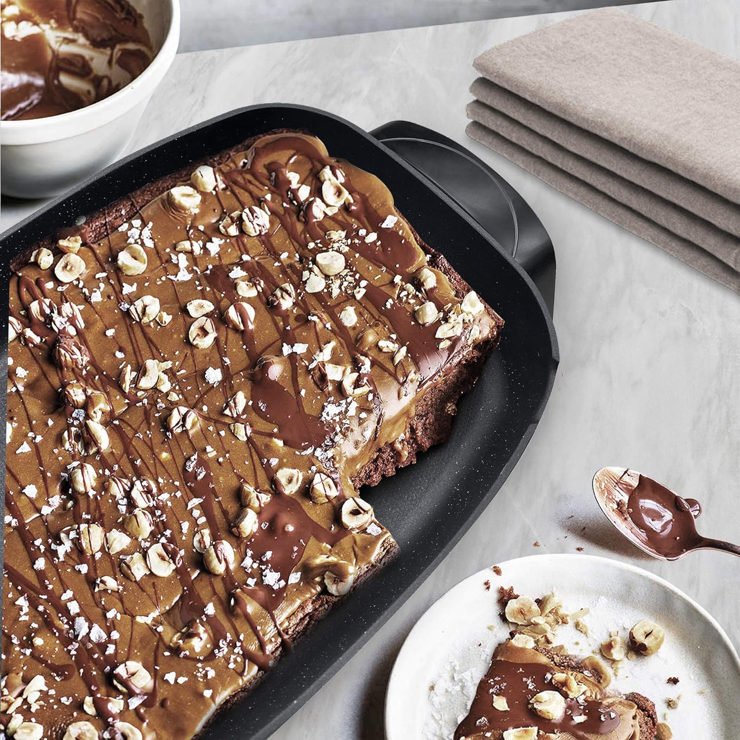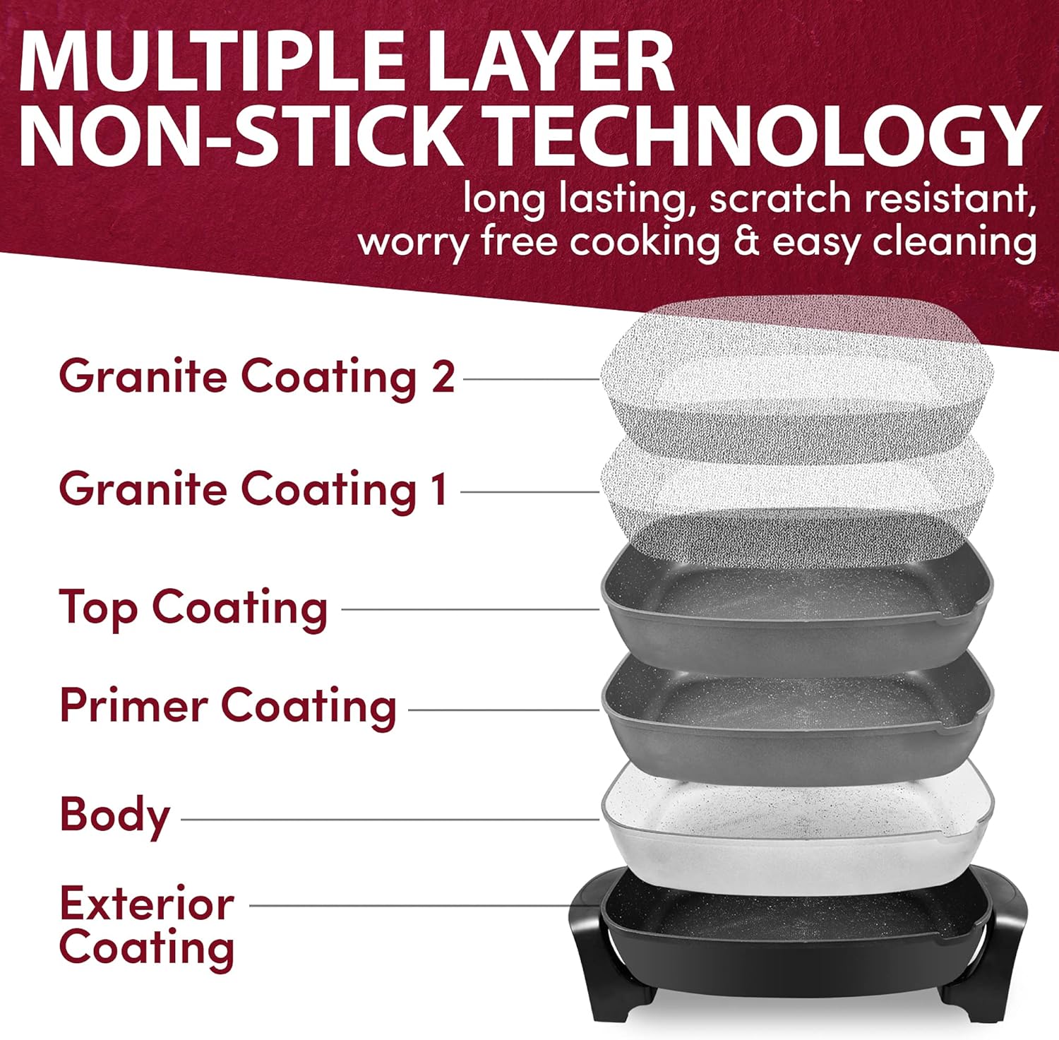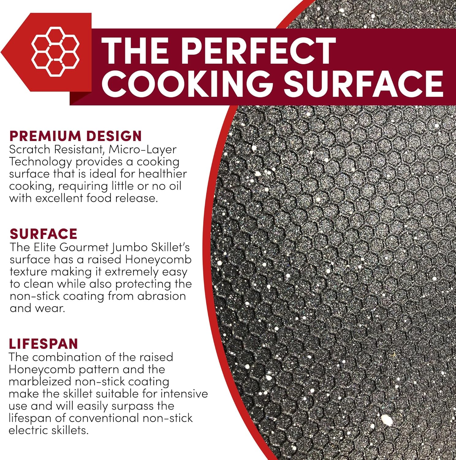 • Marbleized honeycomb non-stick is more durable than non-stick and will not crack or peel. It quickly releases food for a no-fuss quick and easy clean up. Scratch resistant surface allows for worry-free cooking!