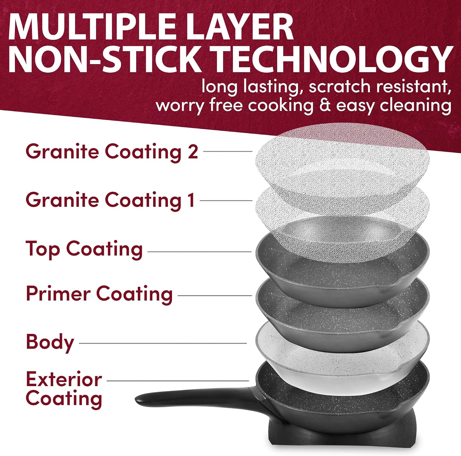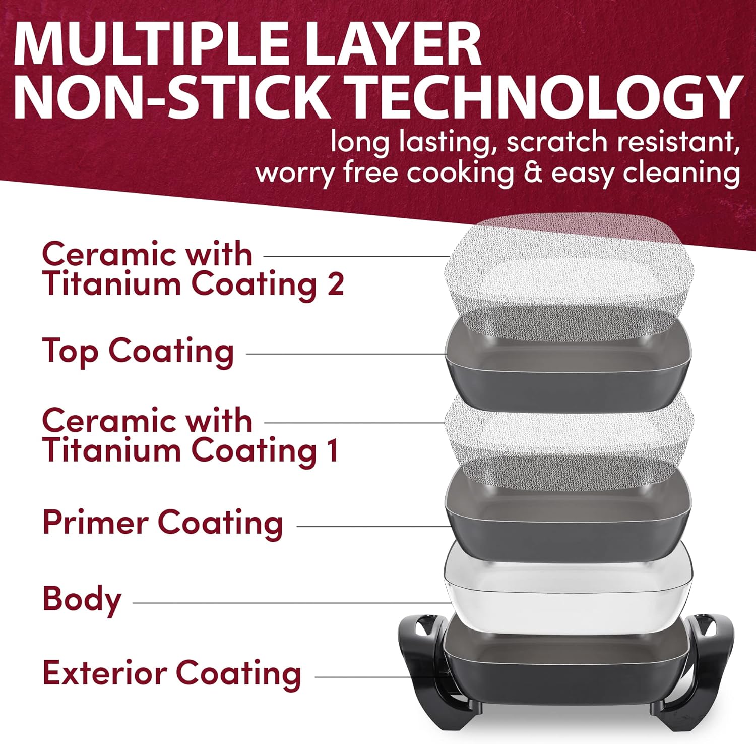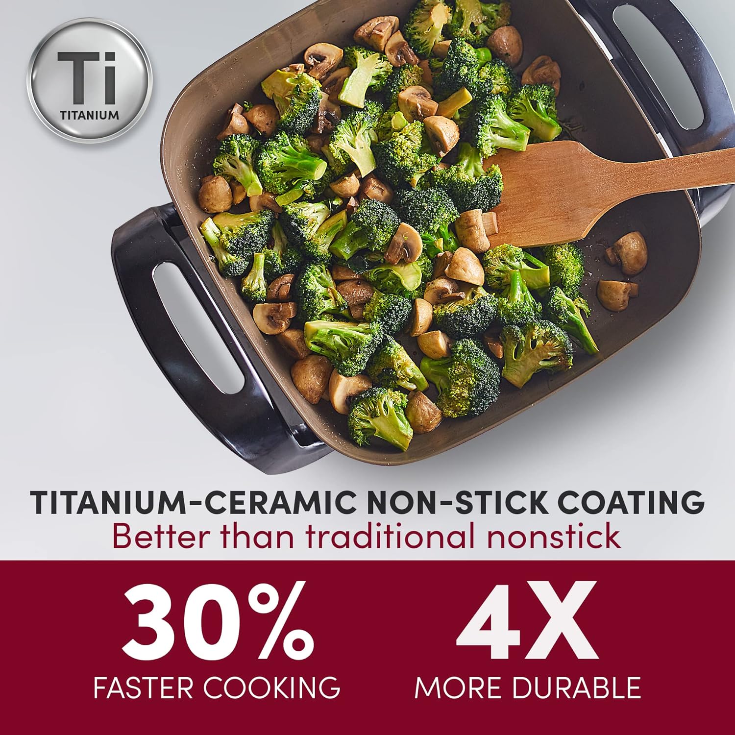 - CERAMIC TITANIUM Coated non-stick is safer and heats up faster than traditional non-stick surfaces. Titanium is incorporated into the Ceramic producing a healthier, stronger, scratch resistant cooking surface than traditional non-stick. It quickly releases food without chipping for safe, no-fuss quick and easy clean up.
