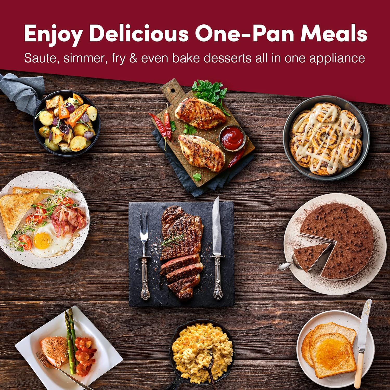 - LOCK IN FLAVORS and moisture and view cooking progress with the vented tempered glass lid. Extra Large 12” x 12” pan dimensions let you cook entire meals for the whole family.