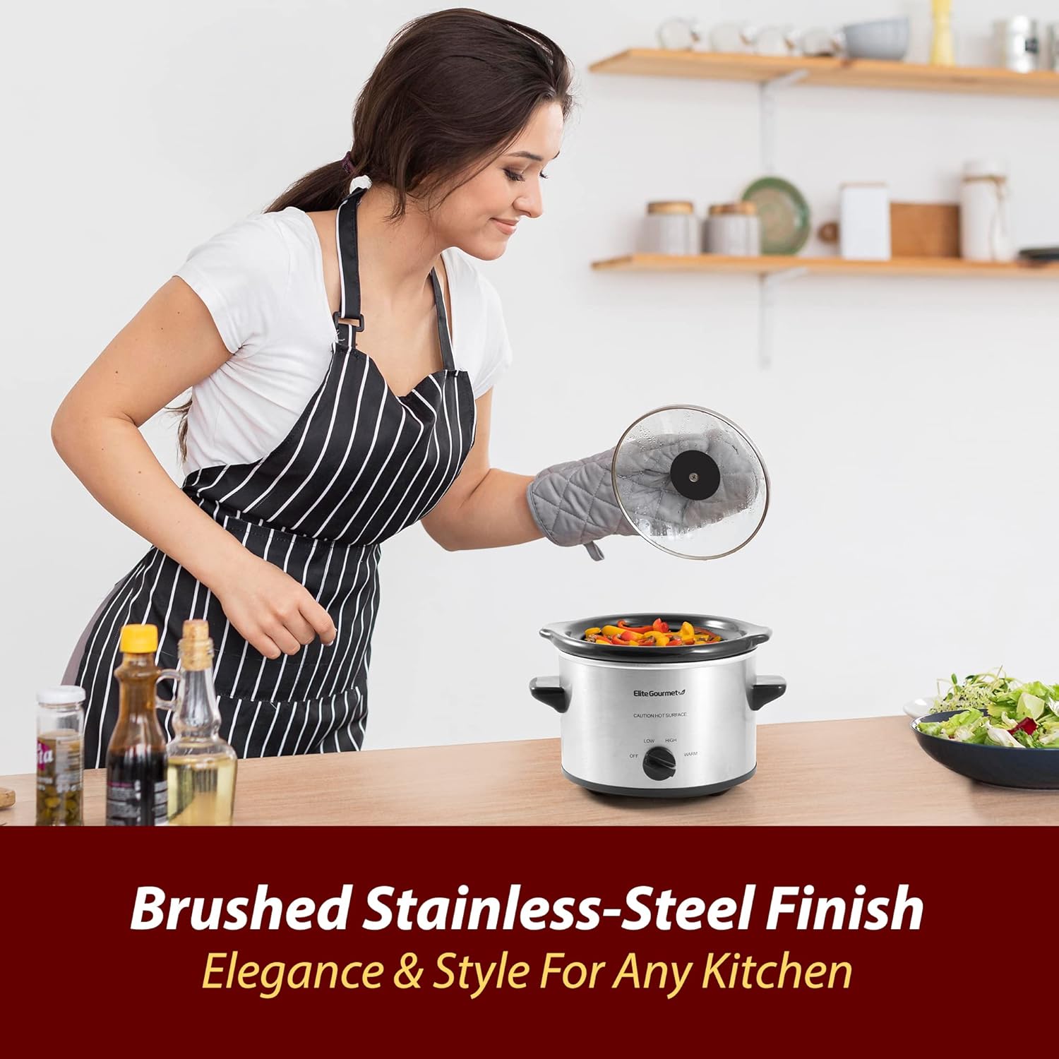 - Elite Gourmet MST-250XS Electric Slow Cooker Ceramic Pot, Adjustable Temp, Entrees, Sauces, Stews & Dips, Dishwasher Safe Glass Lid & Crock, 1.5 Quart, Stainless Steel