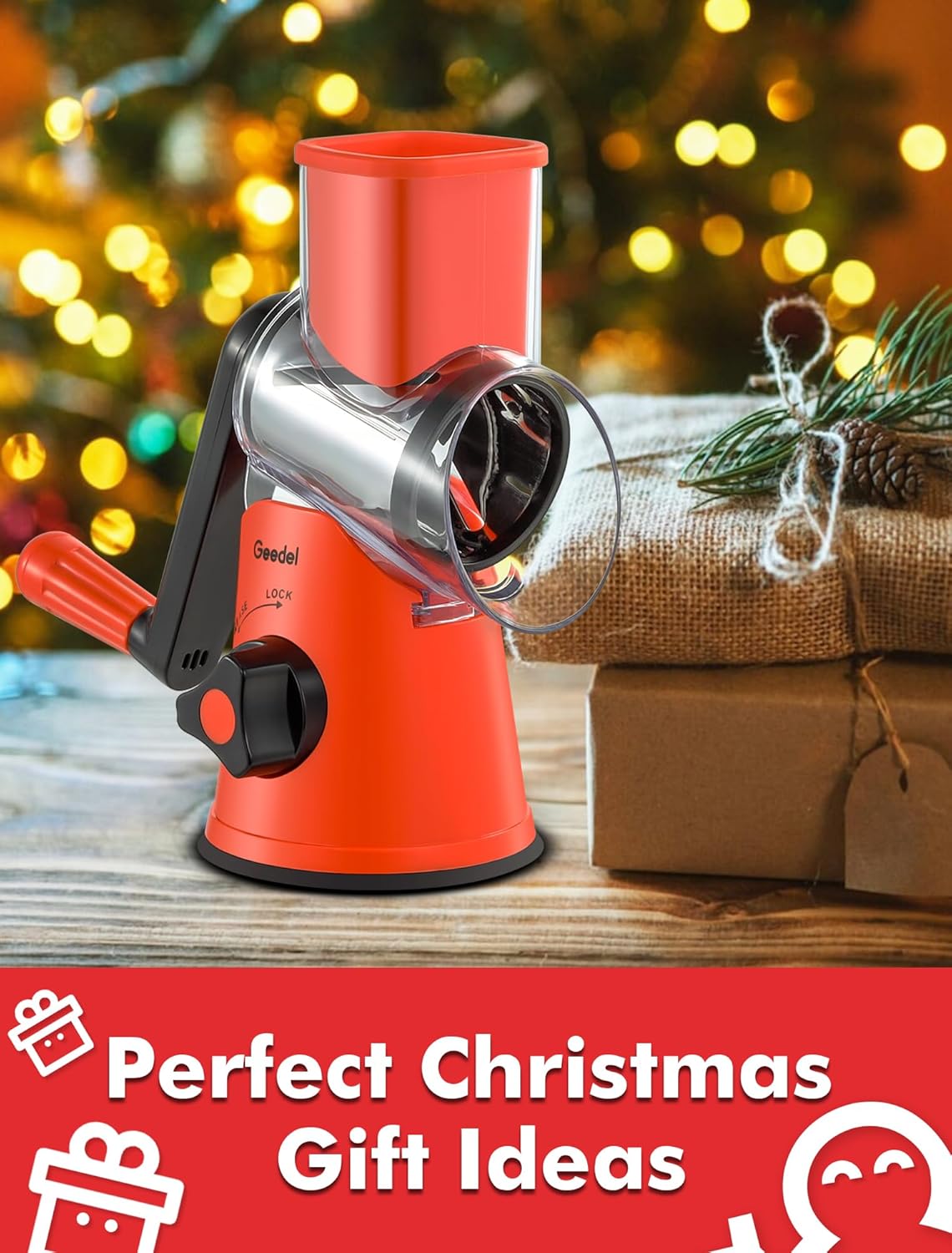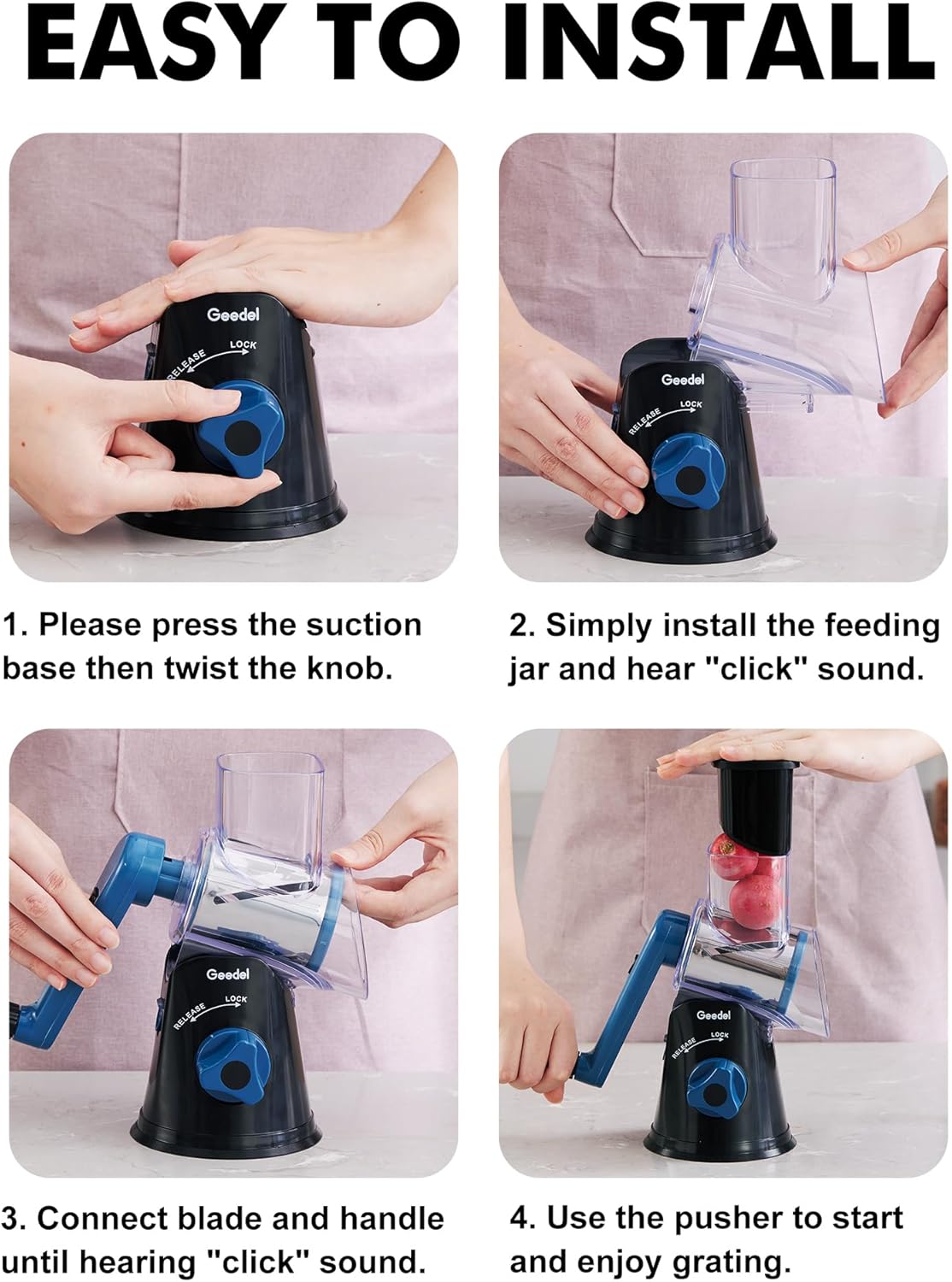 • Geedel Rotary Cheese Grater, Kitchen Mandoline Vegetable Slicer with 3 Interchangeable Blades, Easy to Clean Grater for Fruit, Vegetables, Nuts