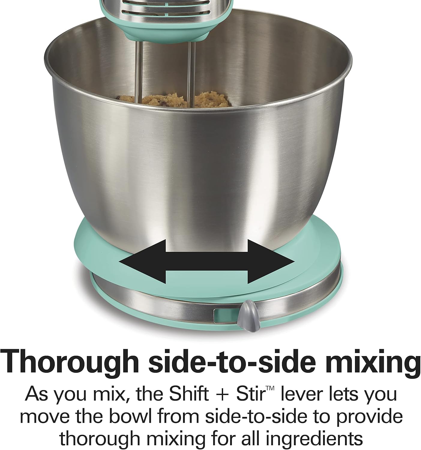 Bowl Rest feature allows the mixer to sit on the edge of the bowl to eliminate messy drips. The Shift & Stir feature rotates the bowl for thorough mixing.