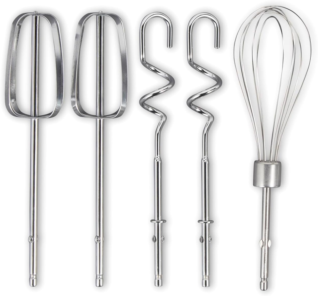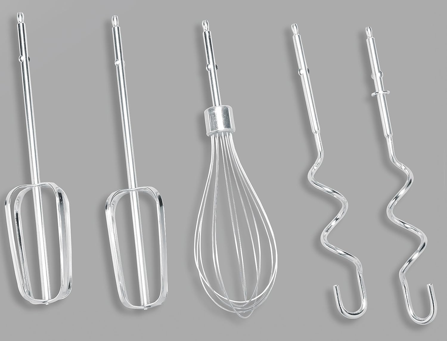 • 5 ATTACHMENTS AND 4 QT. STAINLESS STEEL BOWL. Set includes 2 traditional beaters, 2 dough hooks and whisk, and the 4 qt. bowl is large enough to accommodate your favorite recipes. For easy cleanup, attachments and bowl are dishwasher safe.