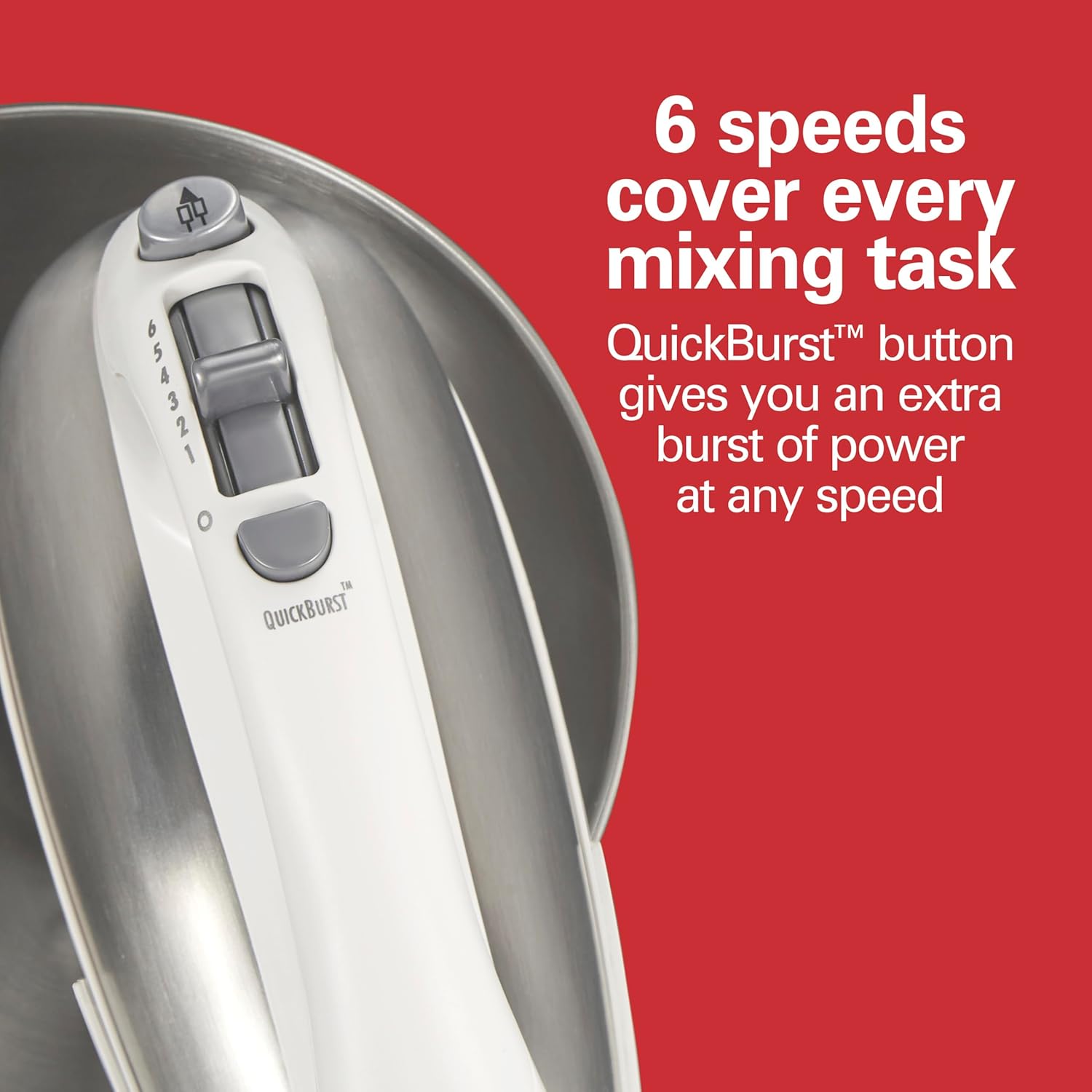 • 6 SPEEDS COVER EVERY MIXING TASK. Go from slowly folding ingredients all the way up to whipping at top speed. This hand mixer has 6 speeds to cover every mixing task and a Quick Burst button for an extra burst of power at any speed.