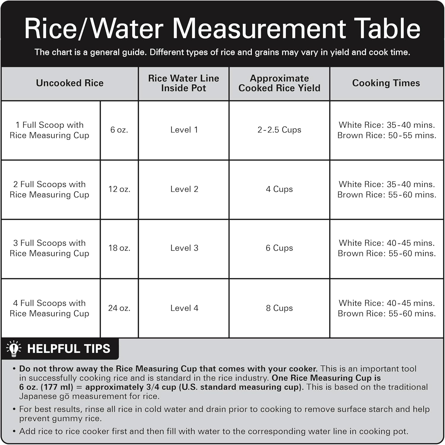 - This appliance holds 8 cups of cooked rice or 4 cups of uncooked rice. One rice measuring cup equals 6 oz. (177 g) or approximately 3/4 cup U.S. dry measure. This is based on the traditional Japanese gō measurement
