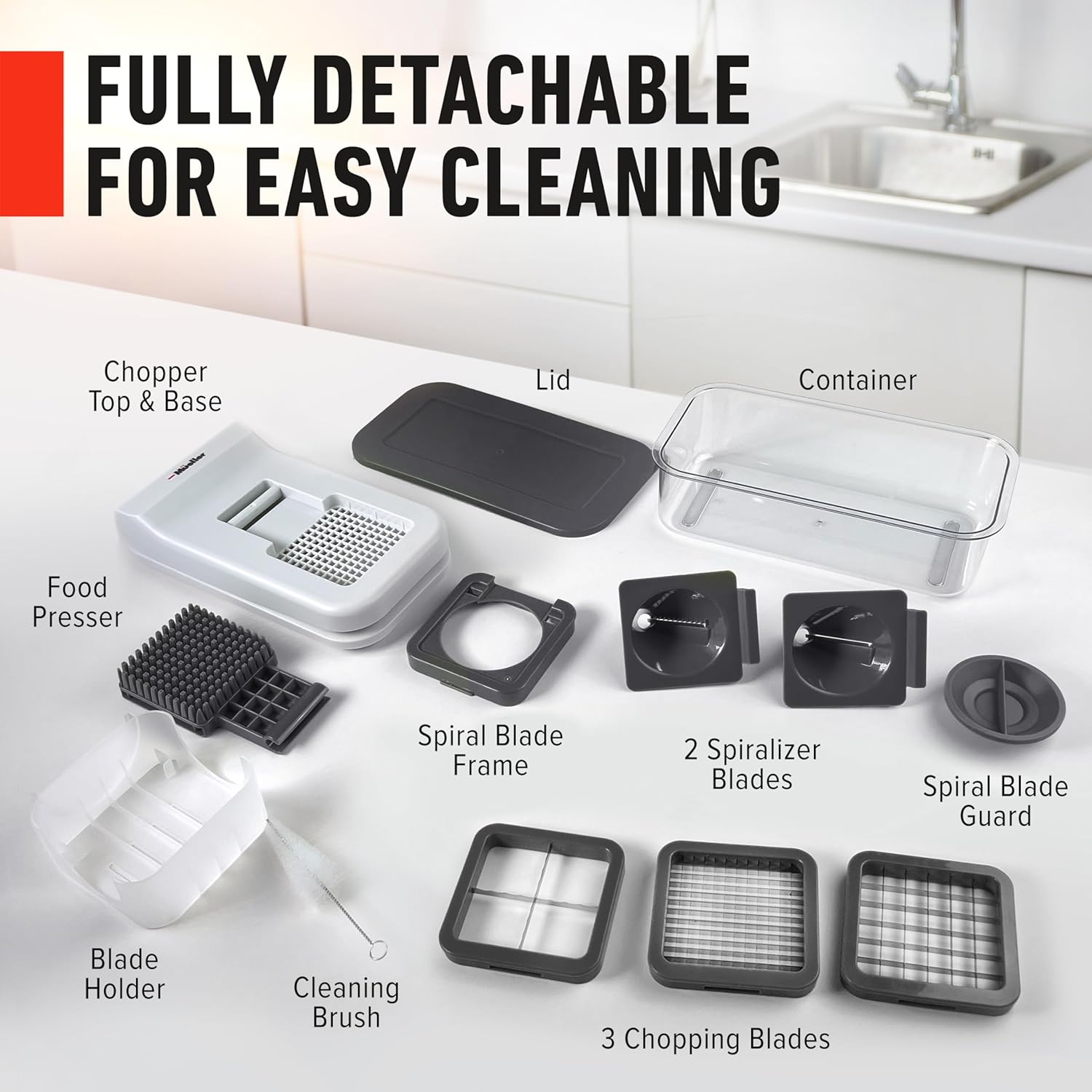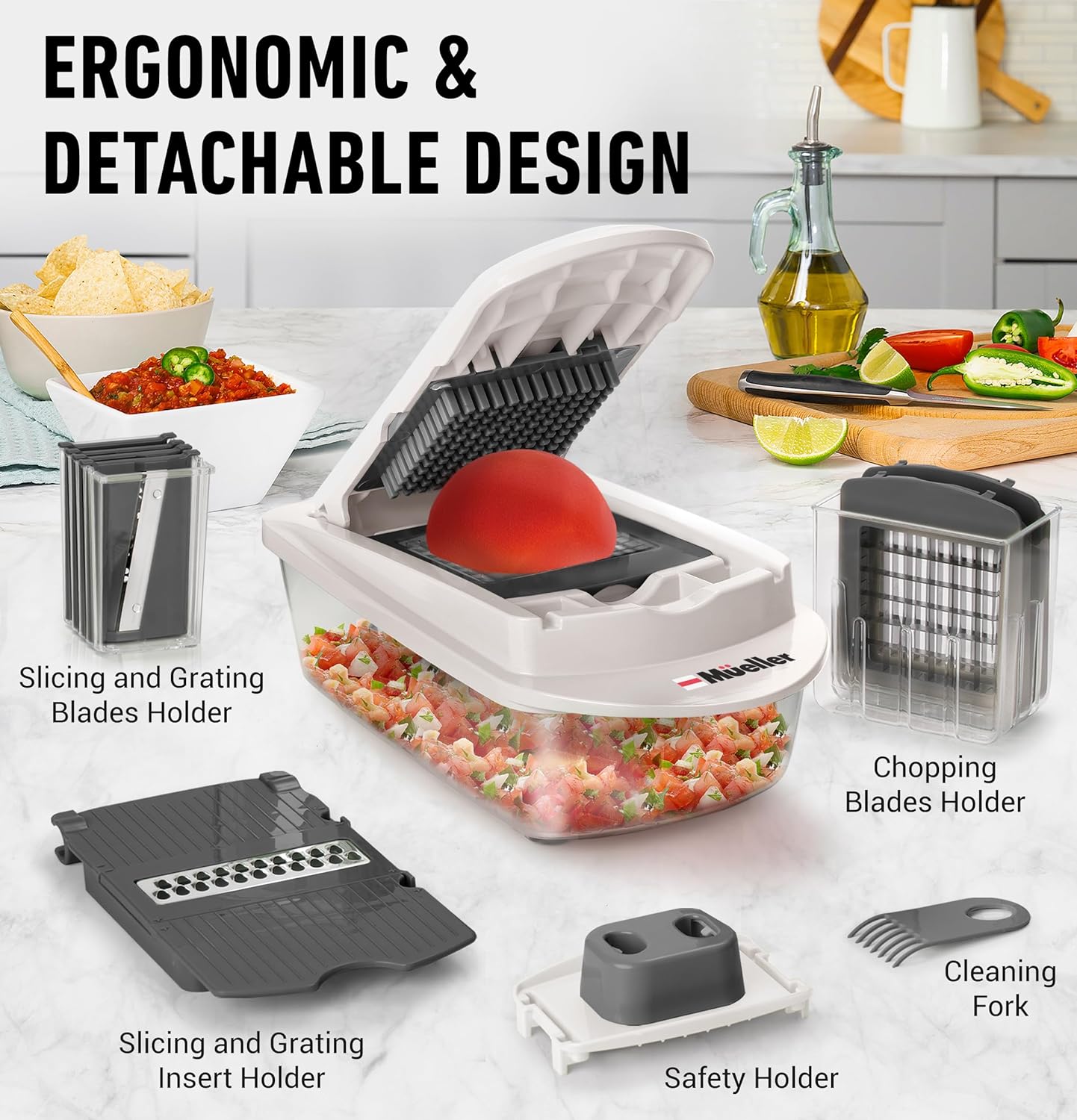 - Space-Saving Design with Convenient Food Holder – Keep your kitchen organized with our compact design and included food container. The secure food holder keeps small ingredients safely in place, reducing slips and mess. Easily dismantle and pop it in the dishwasher or clean it quickly with the included scrubbing fork.