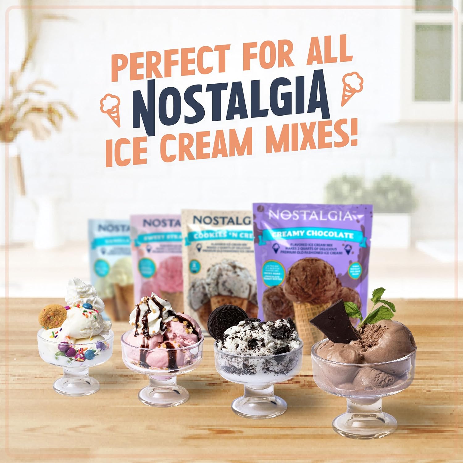 • NOSTALGIA ICE CREAM KITS: Our ice cream machines for home pair perfectly with all Nostalgia ice cream kits. Try the vanilla crème, chocolate, and strawberry ice cream mix or the premium starter kit, which is excellent for a party or snack time.