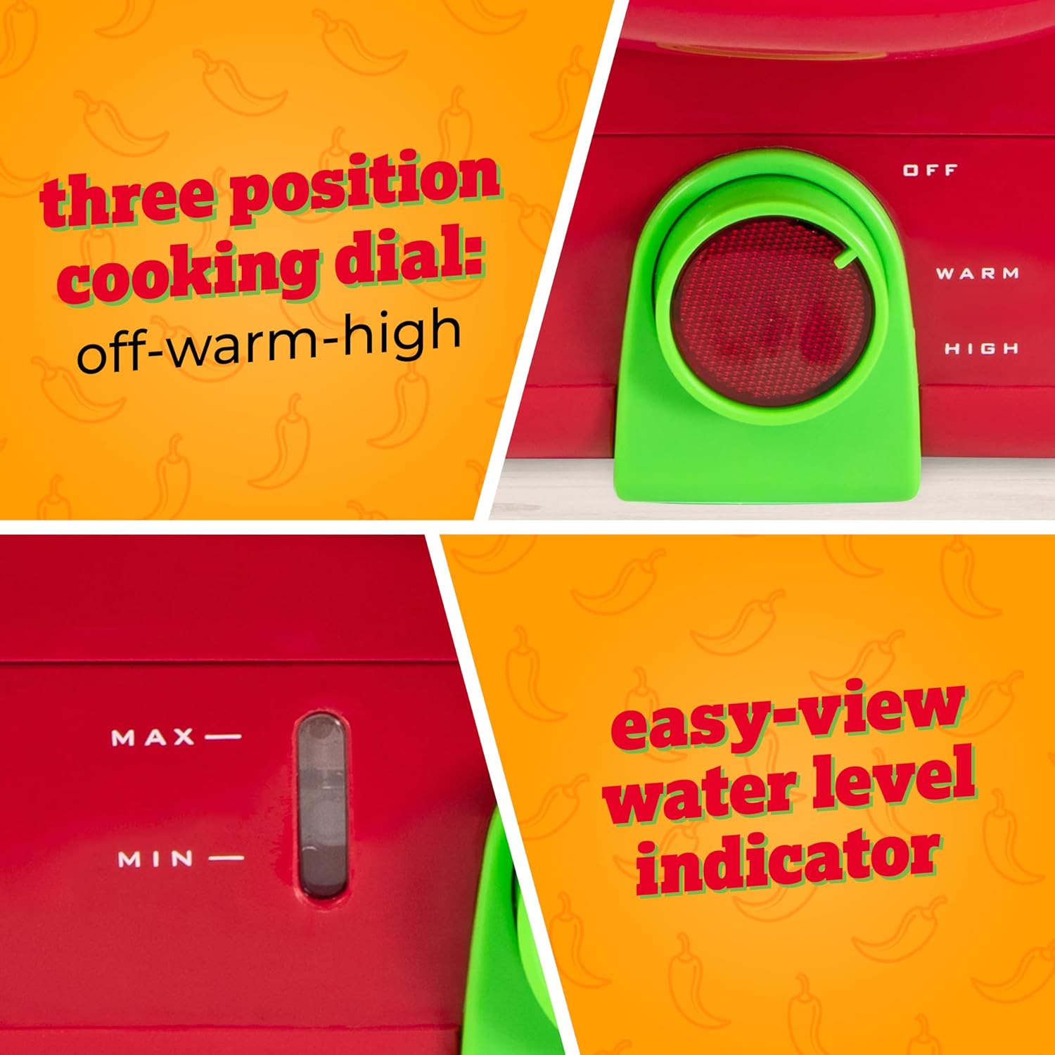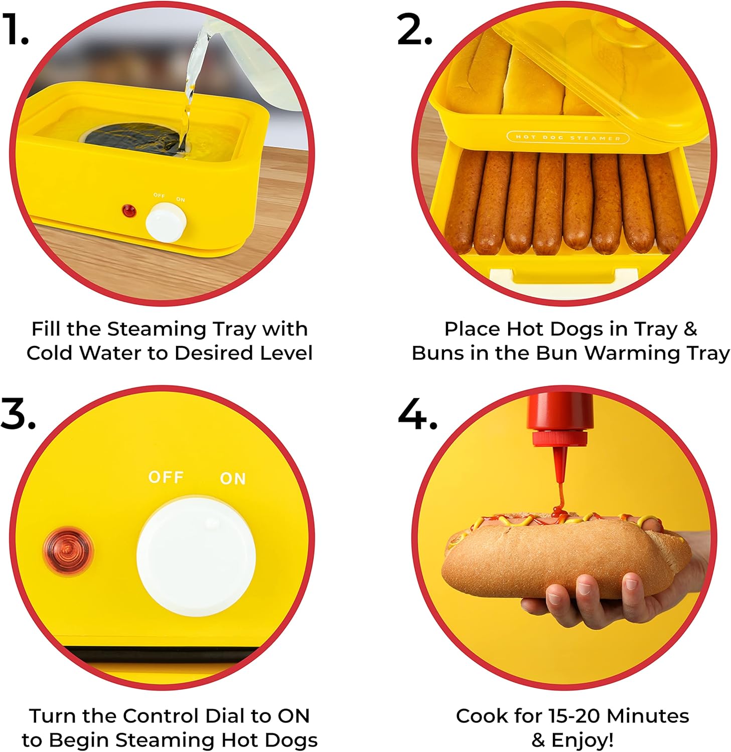 • EASY-TO-USE: 3-position cooking dial (High, Warm and Off) makes cooking effortless - simply add water, put the cover on and turn to High and steamed hot dogs will be ready in 15-20 minutes!
