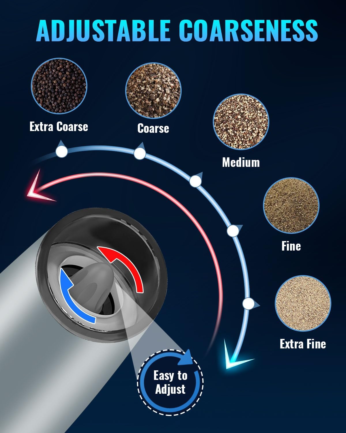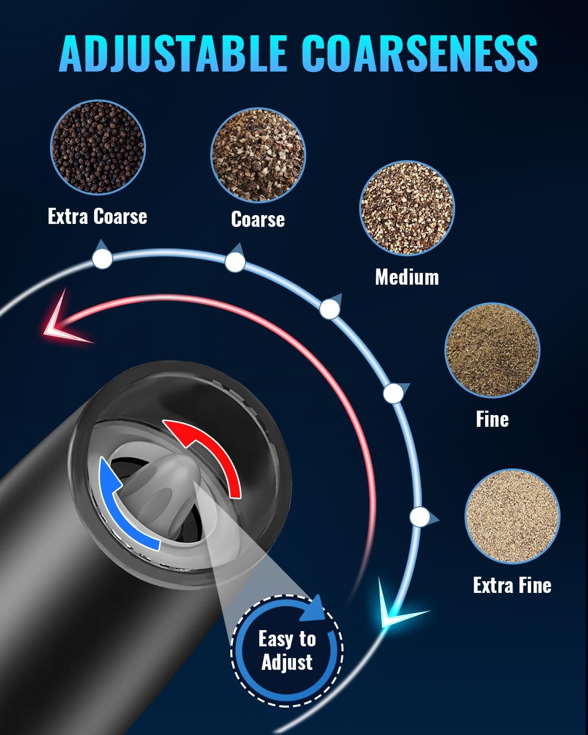 • Sweet Alice Gravity Electric Pepper and Salt Grinder Set, Adjustable Coarseness, Battery Powered with LED Light, One Hand Automatic Operation, Stainless Steel Black, 2 Pack
