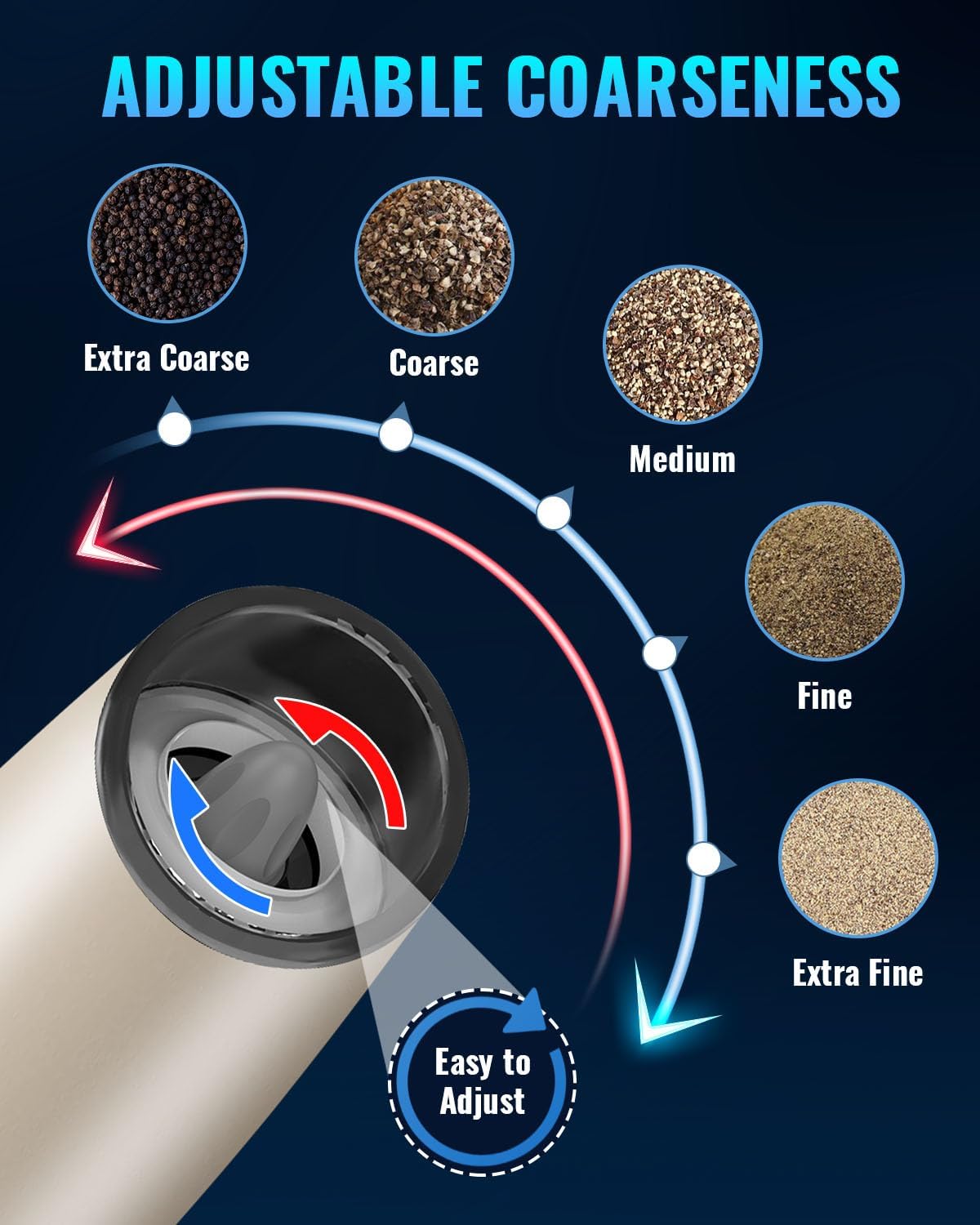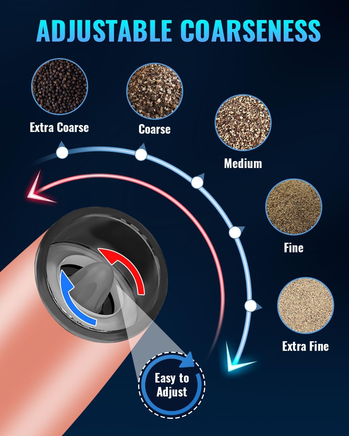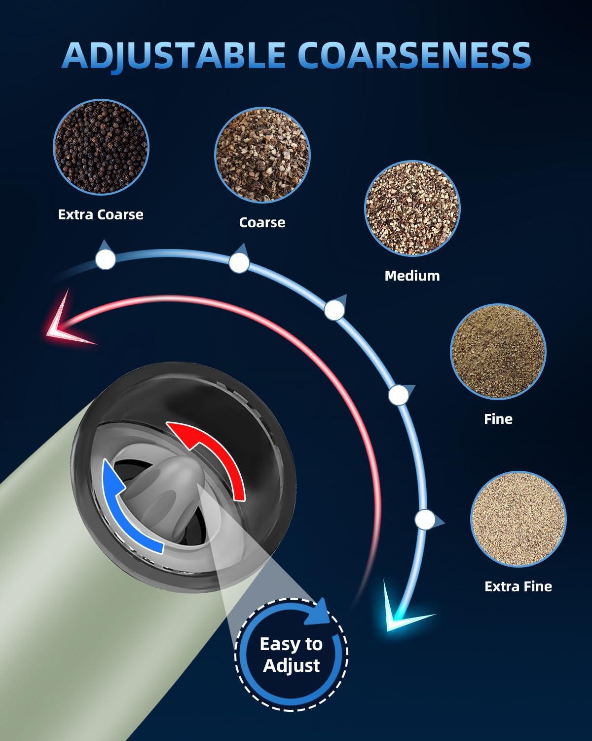 • 【Adjustable Grinder】 Many grinding levels for your choice allows you to grinder your spices from coarse to fine. Electric Pepper and Salt Grinder use a high-quality ceramic rotor. You can choose the coarseness of your spice, salt or pepper by turning adjustment knob at the head of the grinder.