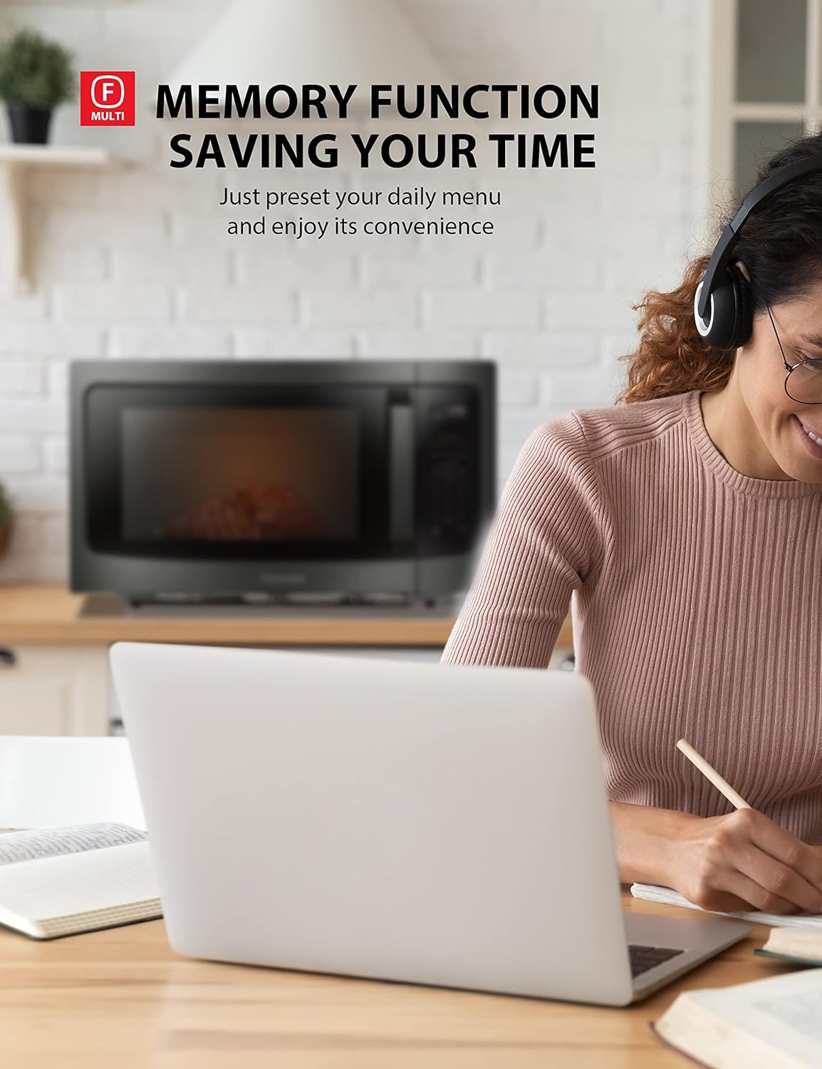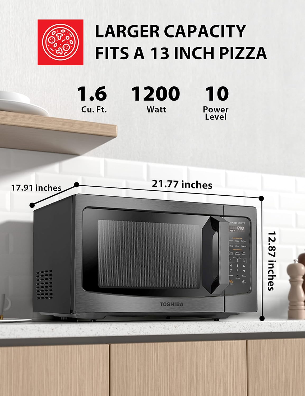 - 【Stylish Appearance with Large Interior, fitting a 12 inch Pizza】Black, exterior, W 23.3 in x D 18.4 in x H 15 in; large 1. 2 cubic feet capacity, Turntable Diameter 12.4 inch, interior: W20.5 X D17.2 X H12.8