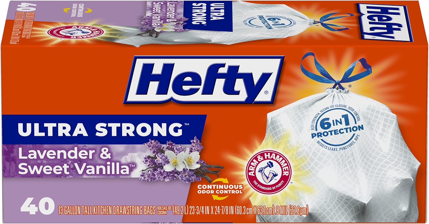 - 13 Gallon Garbage Bags—This package contains 80 Hefty Ultra Strong 13 Gallon Trash Bags in White, Lavender and Sweet Vanilla Scent