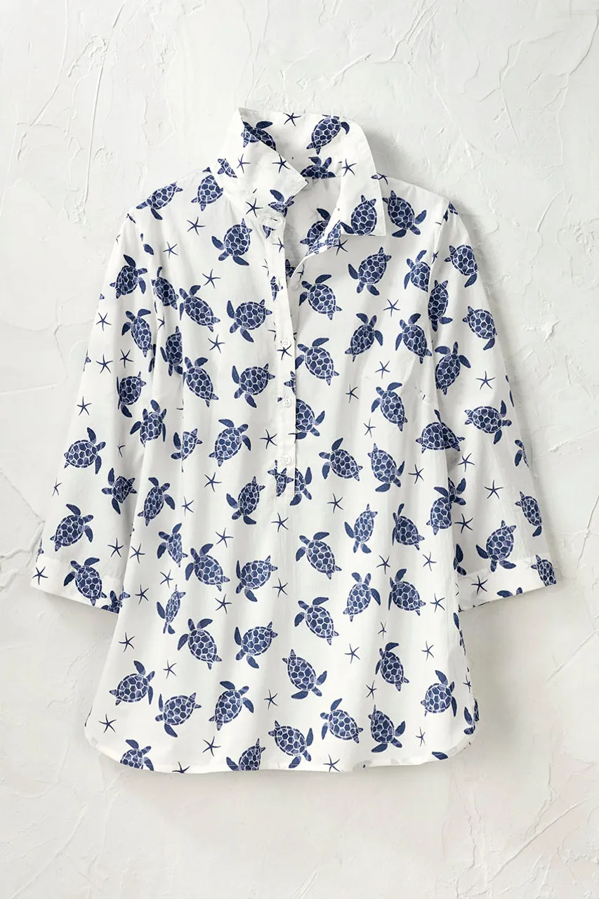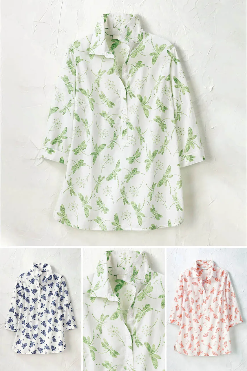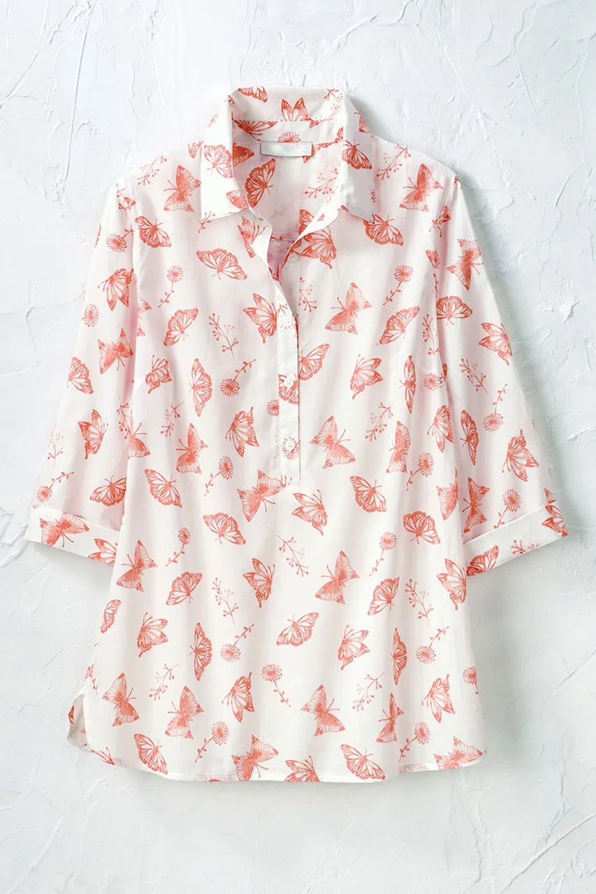 Lighthearted and lightweight, these made-for-summer popovers feature friends from nature in whimsical prints. Airy and breathable in semi-sheer cotton voile – wear with one of our tanks or camis. Half-button placket, pleated back yoke, bust darts, 3/4 sleeves.