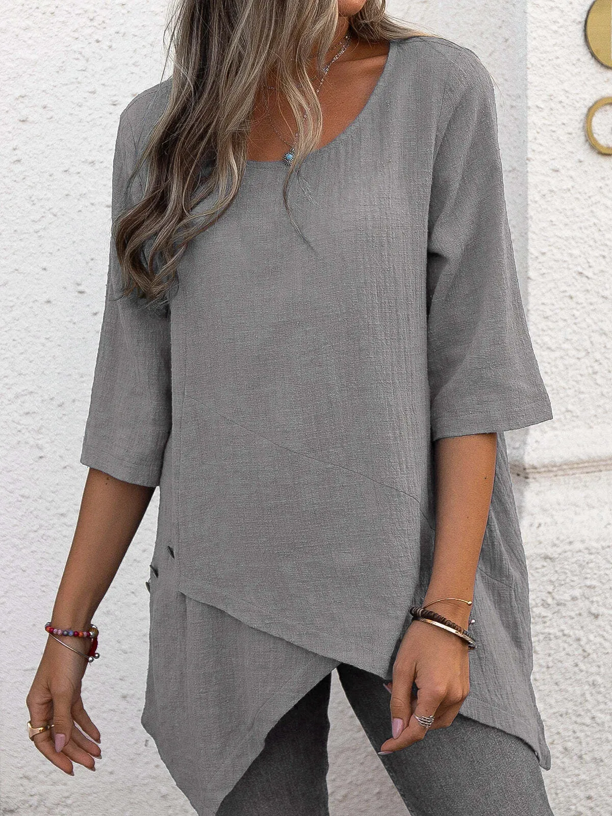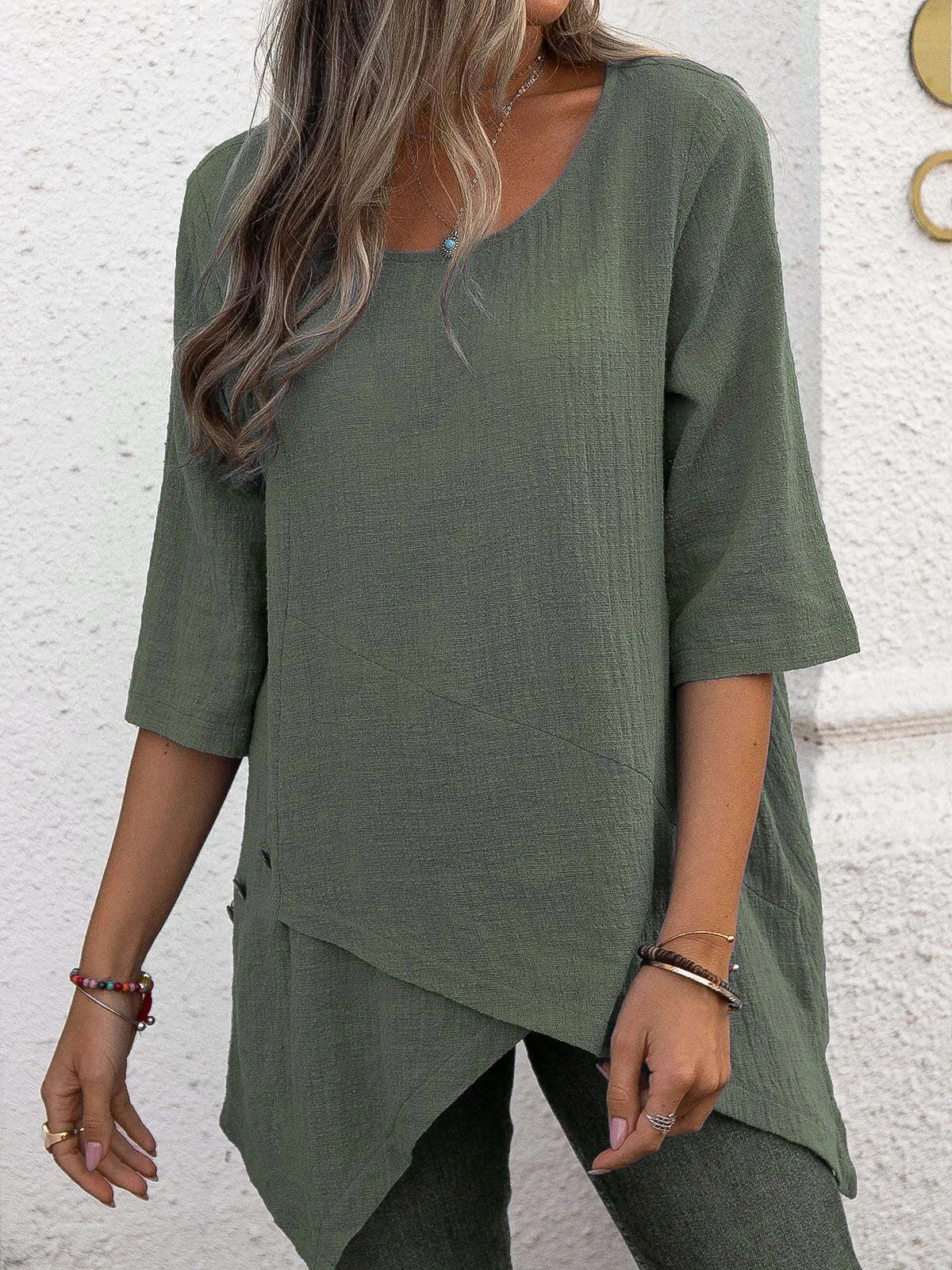 Cotton Linen Round Neck Irregular Half Sleeve Blouse
