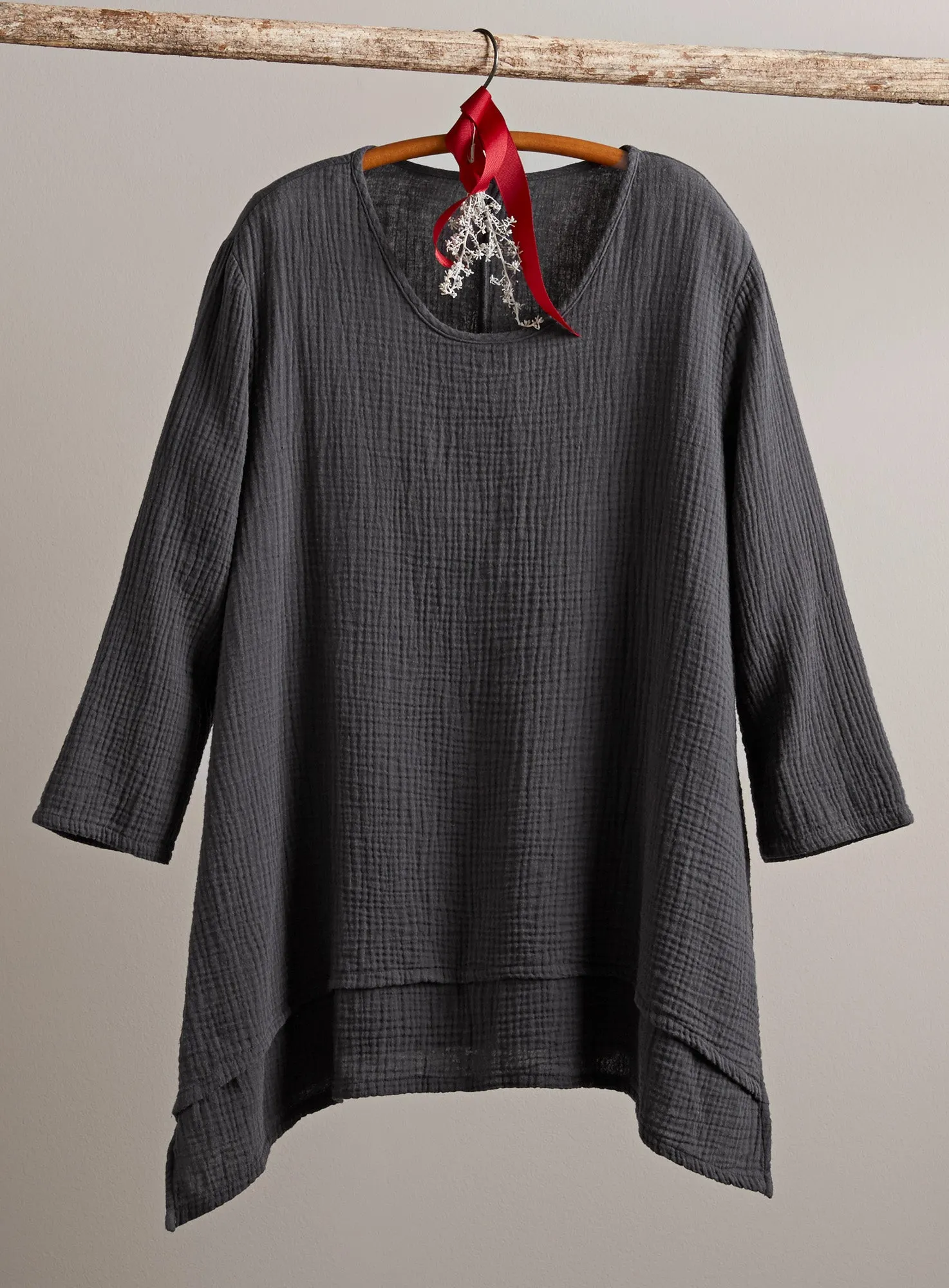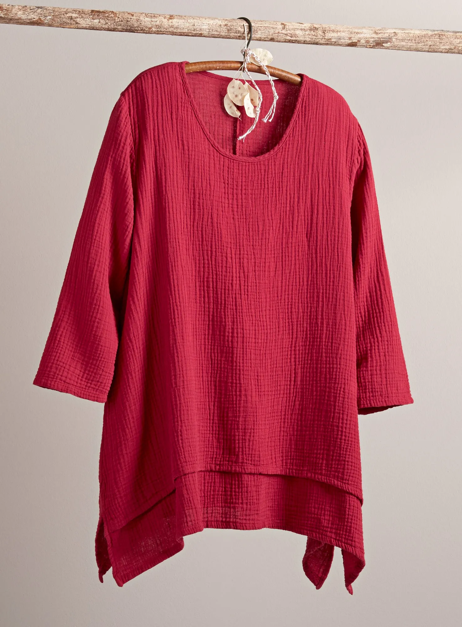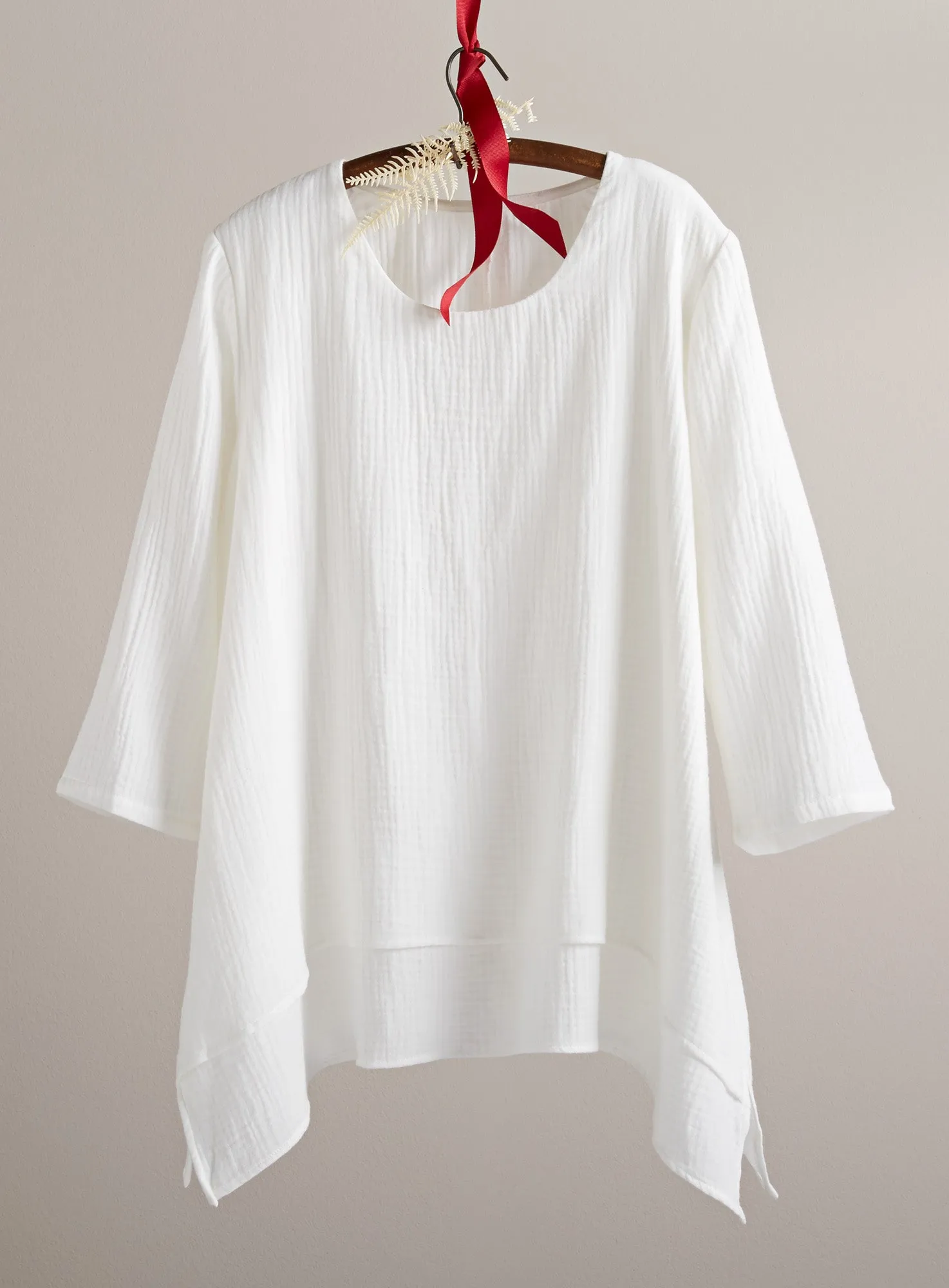 With a handkerchief hem and an artsy pieced design, this is one of the easiest Cotton Ripple tops to dress up or dress down. A double layer in the front ensures it's never too sheer. And 3/4-length sleeves suit petites and tall folks alike.