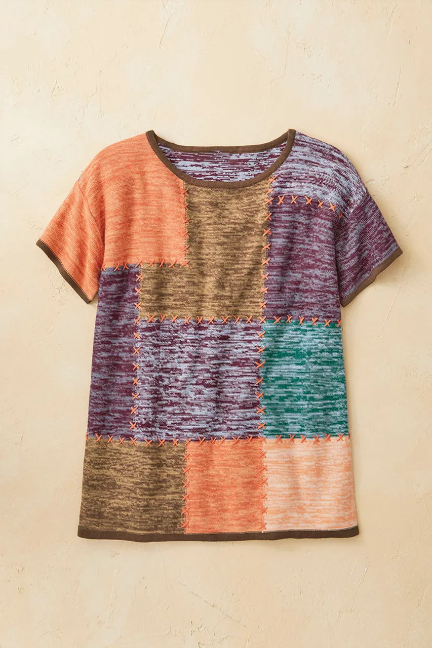 Space-dyed yarns and artful stitching details make this multicolored sweater an easy statement piece. Lightweight and drapey, with colorblocking on the front, short sleeves, and a solid marled back. Slightly dropped shoulder seams.