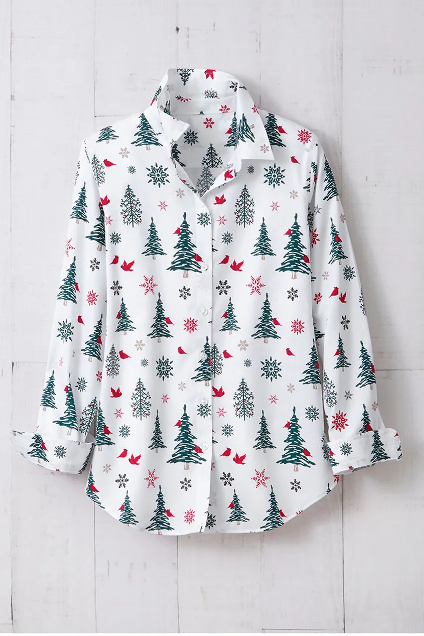 Our signature wrinkle-free shirt, cheered for the season in a print of evergreens, cardinals and snowflakes. Great tucked in or not.