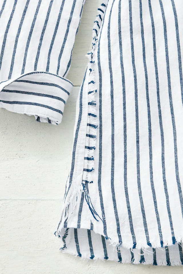 Fresh stripes, frayed details in a lightweight cotton/linen blend that's so cool to wear into warmer days. Full button front with frayed seams, front patch pocket and button-cuff long sleeves.
