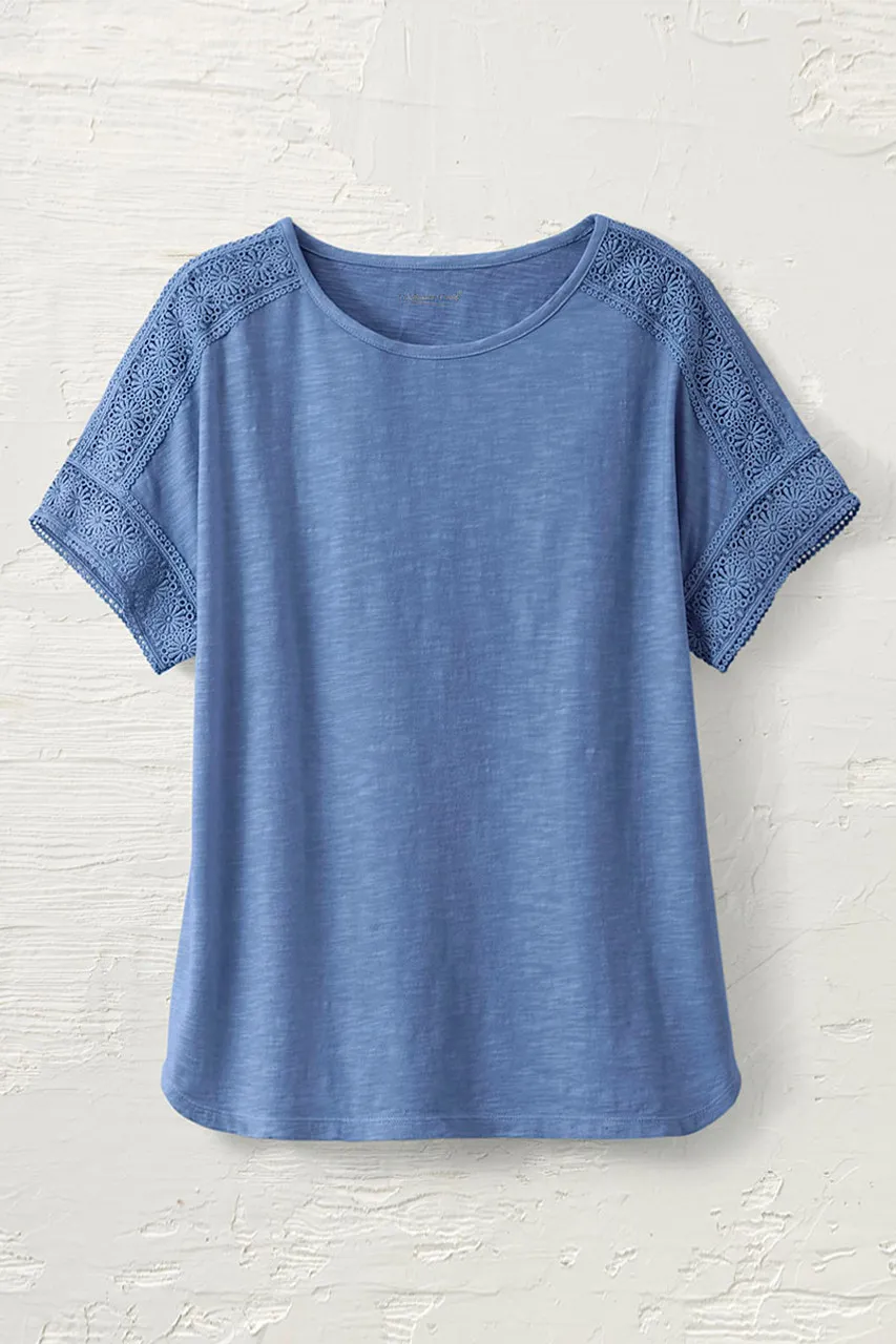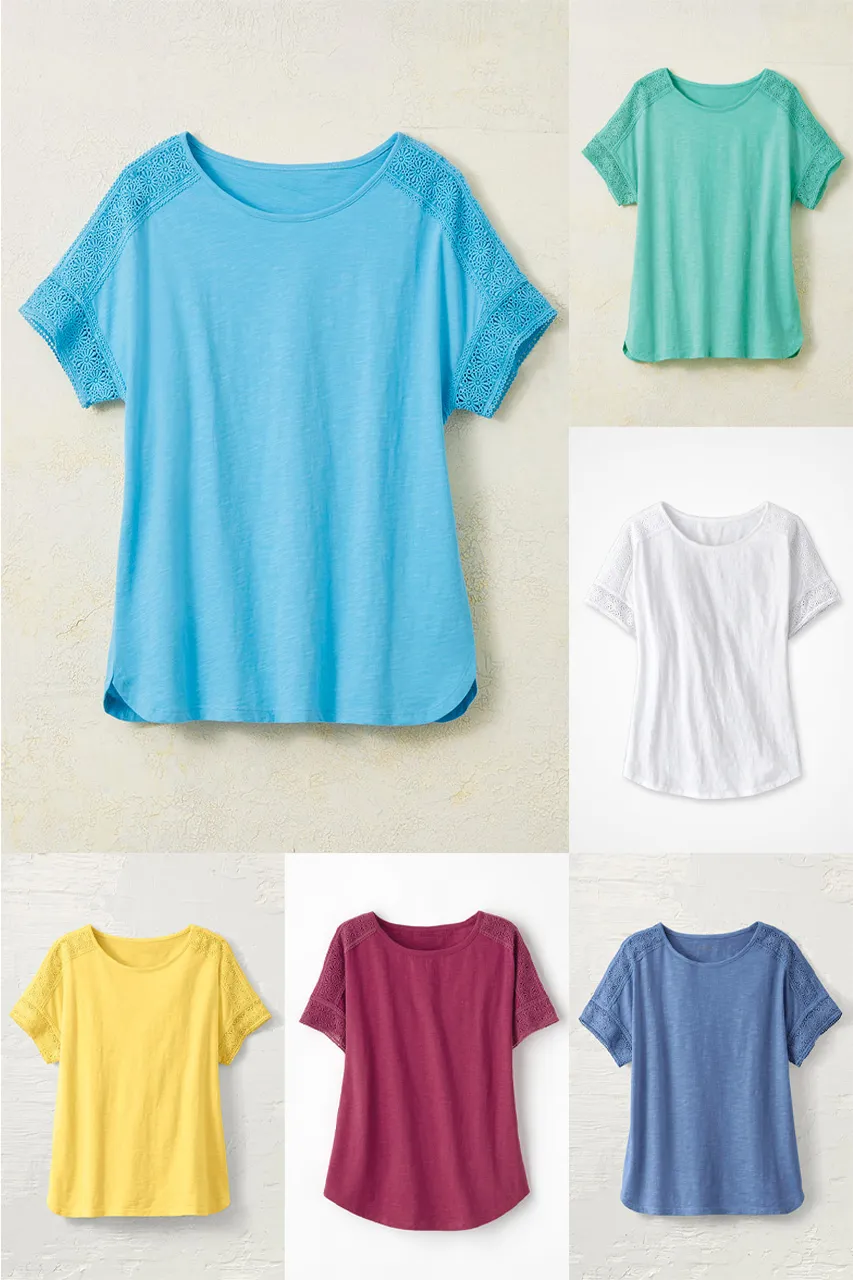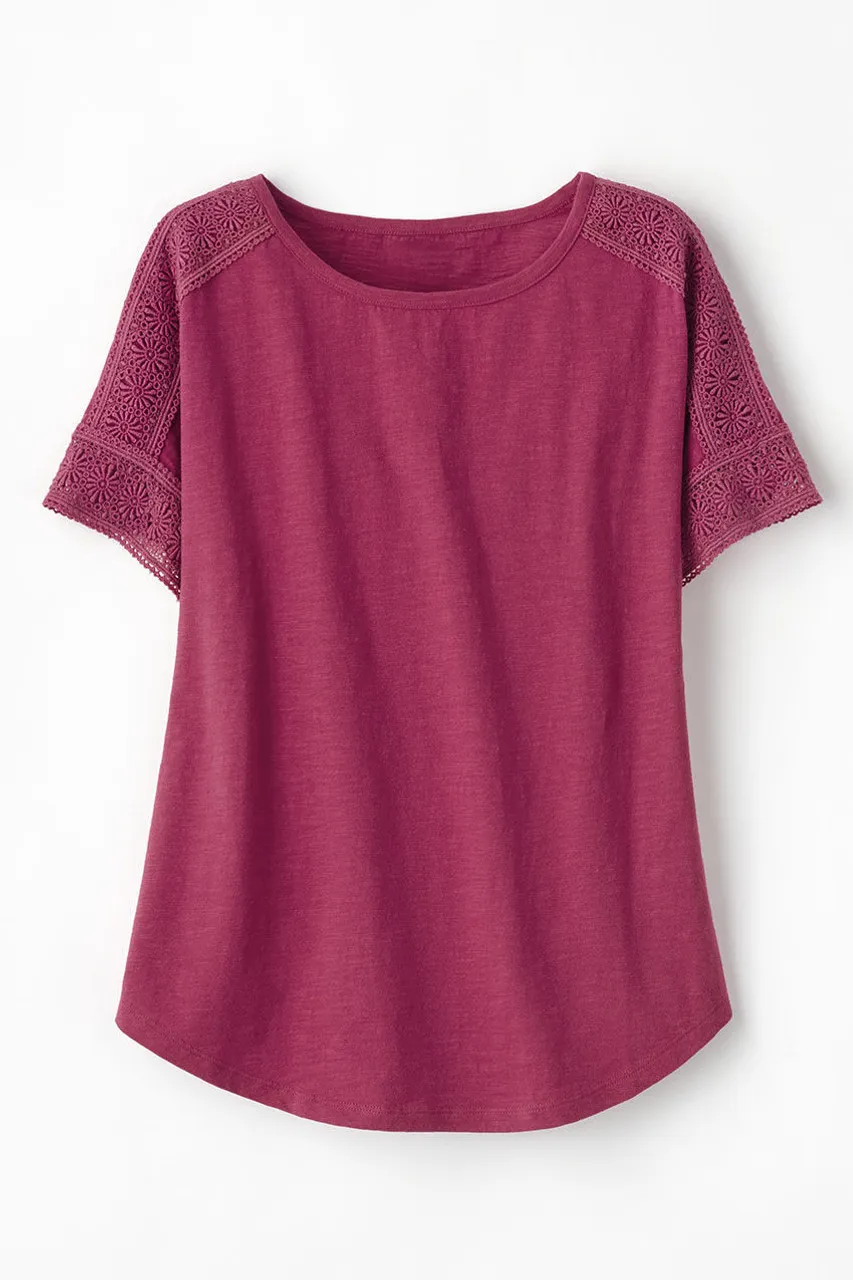 Little lacy daisy chains trim this cheerful cotton knit slub tee, overlaid along the shoulders and edging the sleeves. Rounded hem, boatneck. Imported.