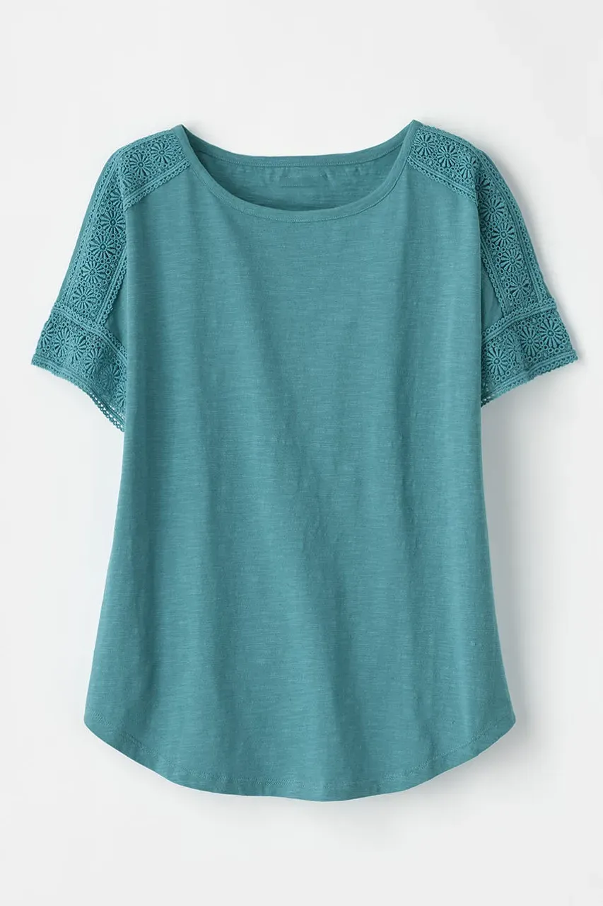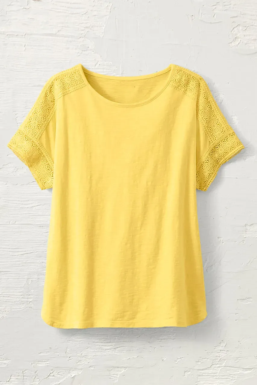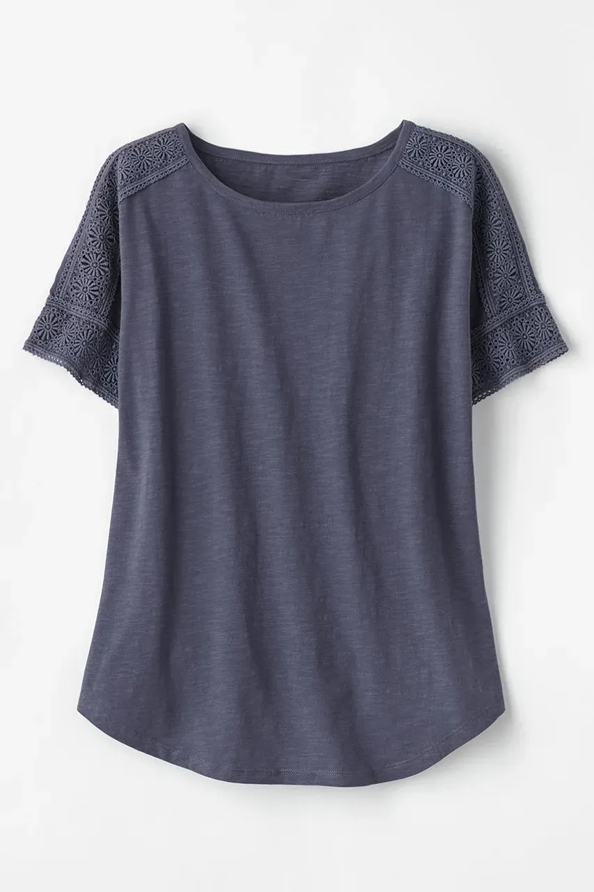 Little lacy daisy chains trim this cheerful cotton knit slub tee, overlaid along the shoulders and edging the sleeves. Rounded hem, boatneck. Imported.