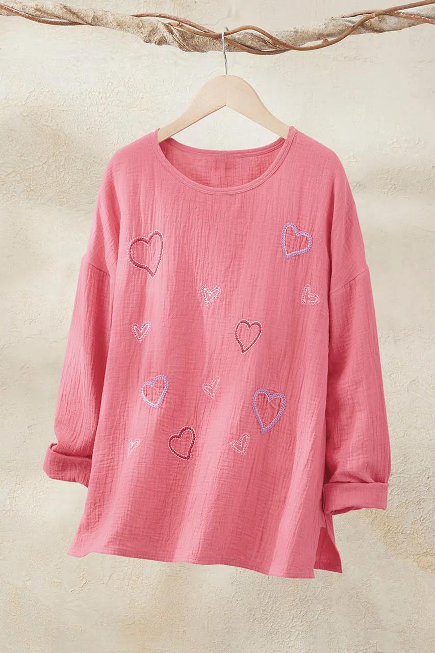 Love comes easy in a light pullover style of softly crinkled gauze – sweetened for the season with playful embroidered hearts. Dropped shoulders and side slits.