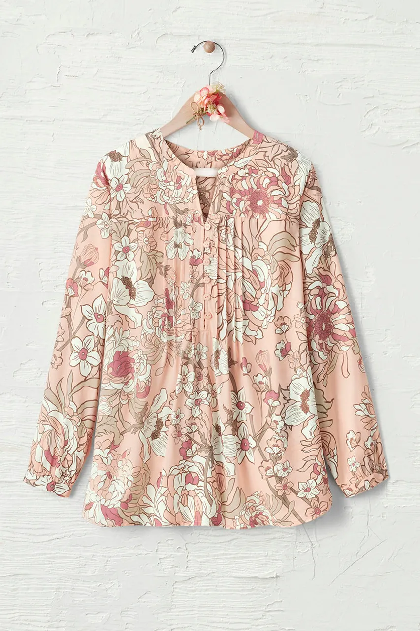 Blushed with lavishly sketched florals, in our flattering tuck-and-release silhouette. Slipover style has buttoned half-placket, pleated back yoke and slightly curved hem.