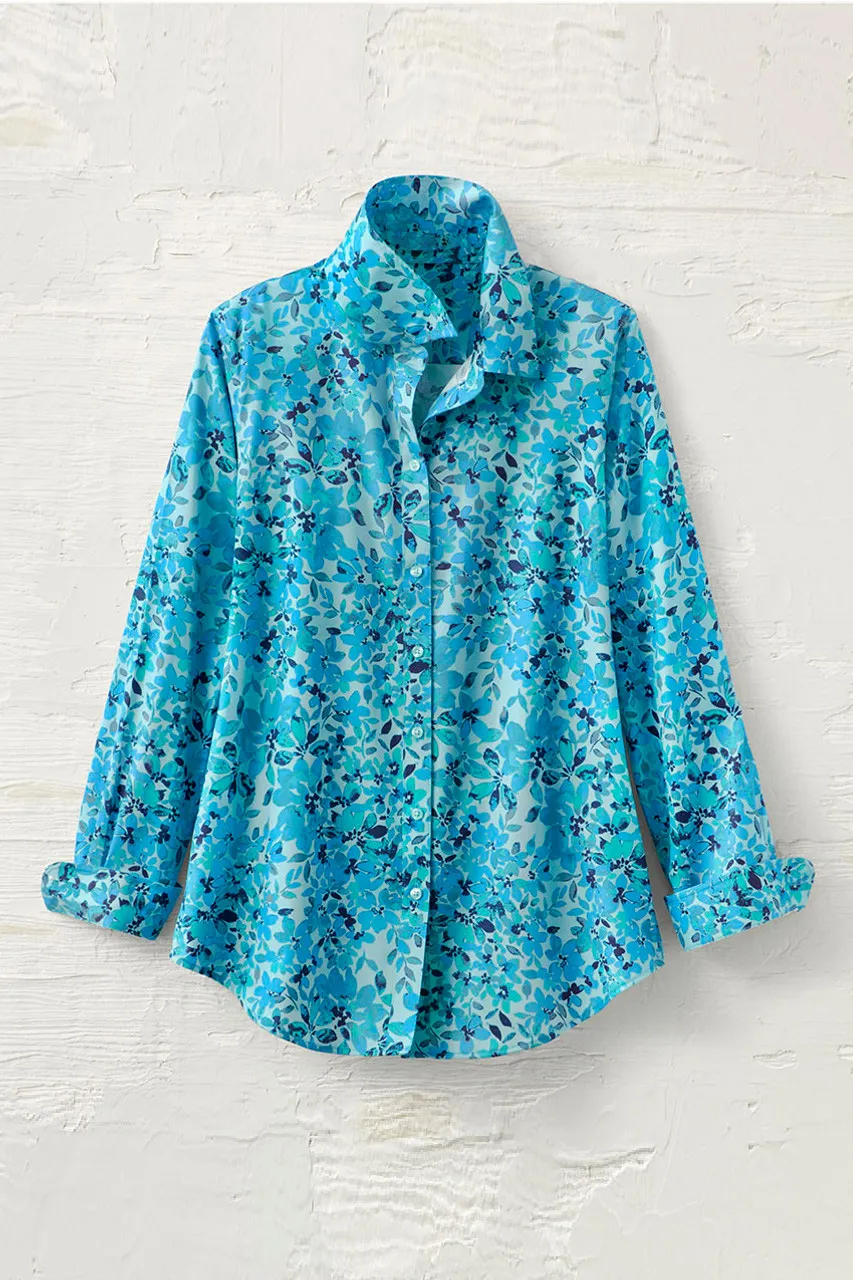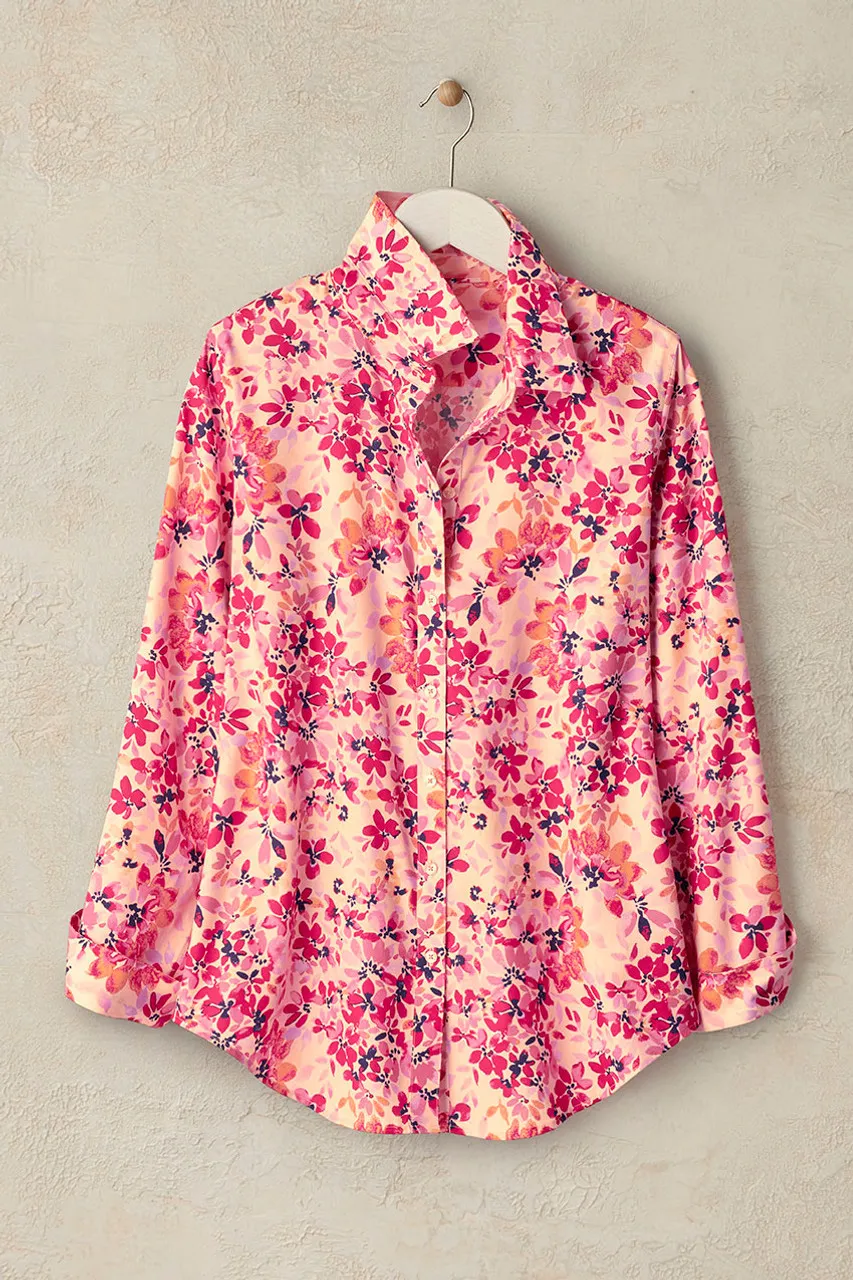 A color-rich watercolor floral, to welcome the season with wrinkle-free ease. Great tucked in or not, with reinforced placket.