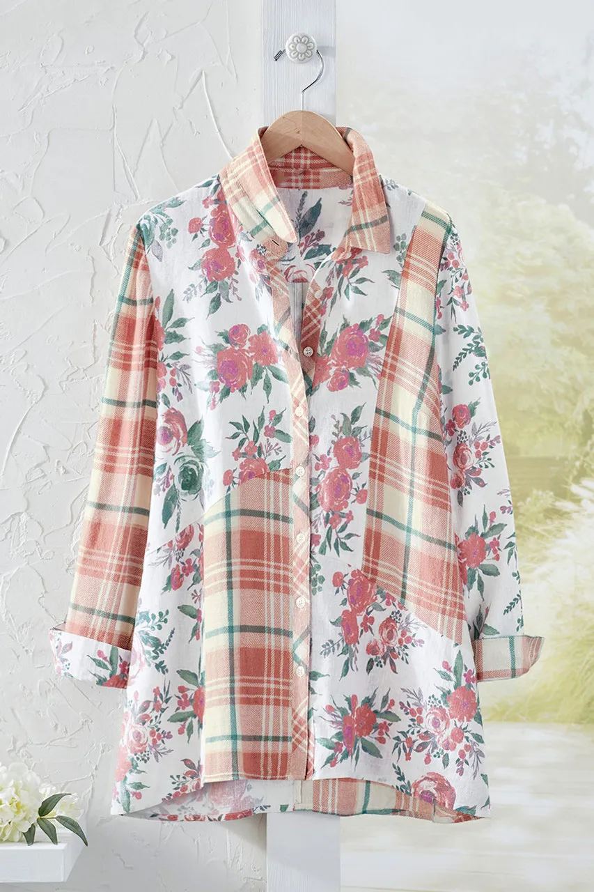 Rosy florals complement plaids, pieced into a happy mix on this soft-brushed shirt. High-low hem.