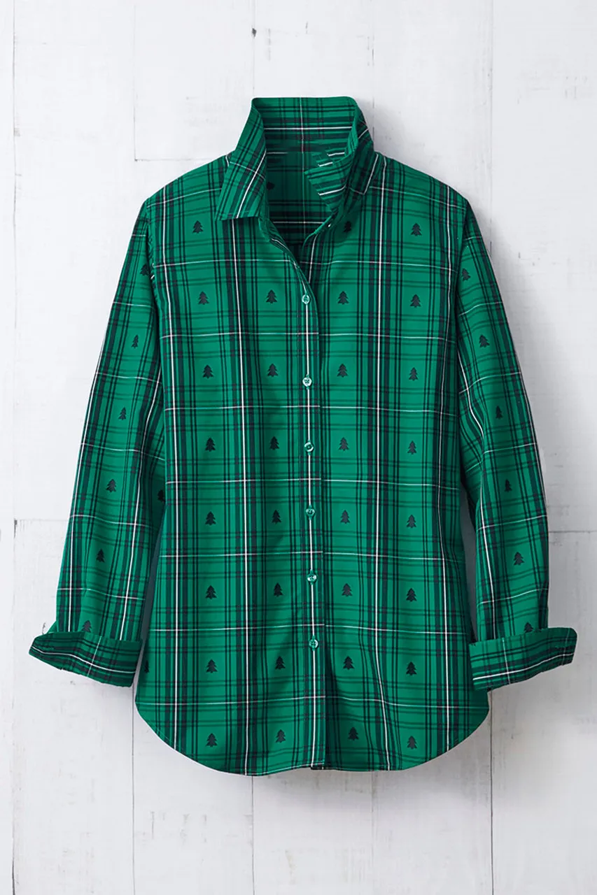 A rich emerald plaid, spruced with pine trees for a festive spirit. Our wrinkle-free shirt is great tucked in or not.