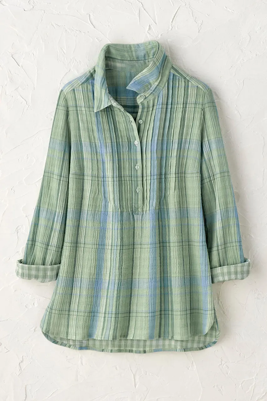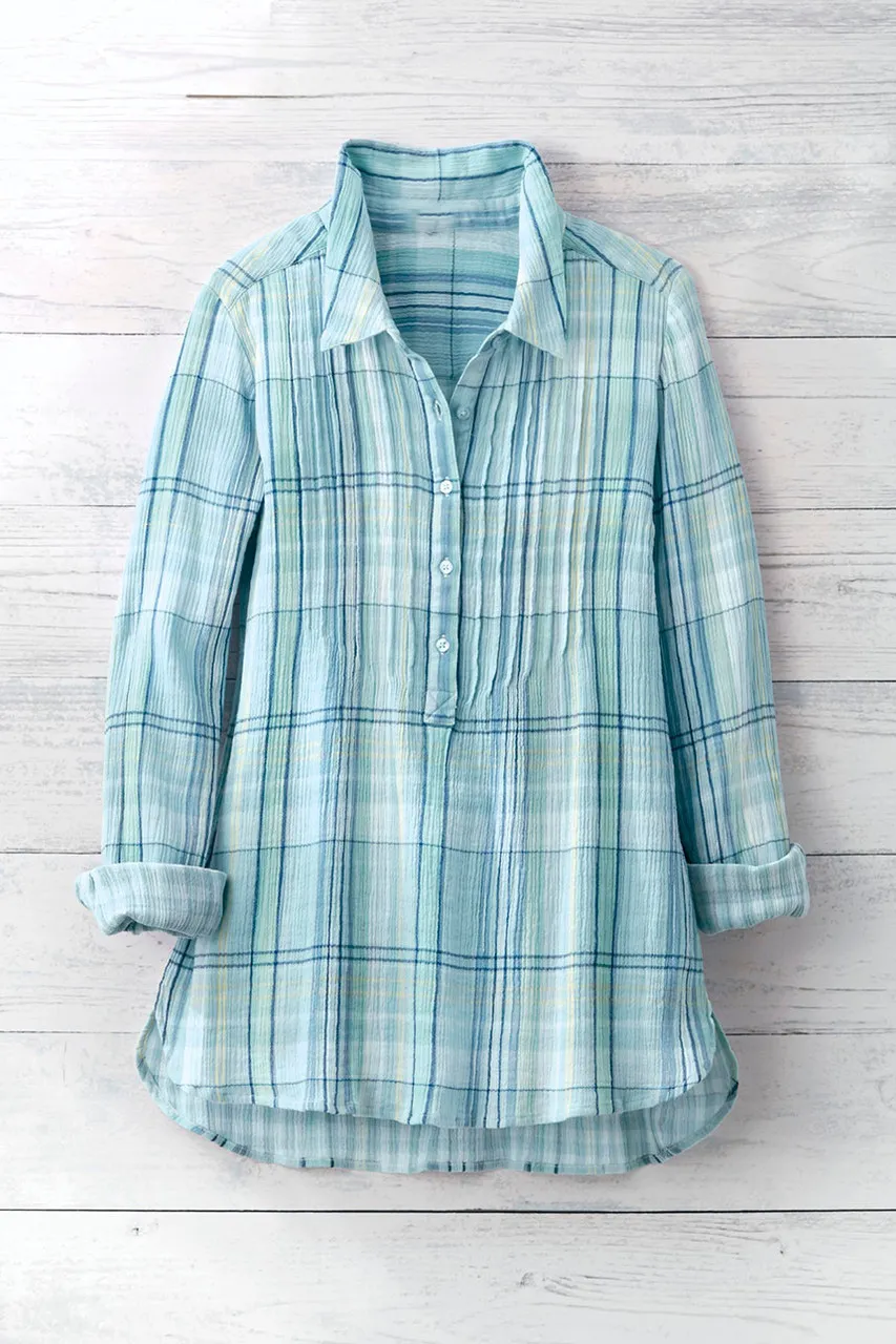 Enjoy some pattern play in our double-faced gauze top – plaid outside and checked inside, rippled with light texture. Slipover style has buttoned half-placket, pleated back yoke and slight high-low hem with side slits.