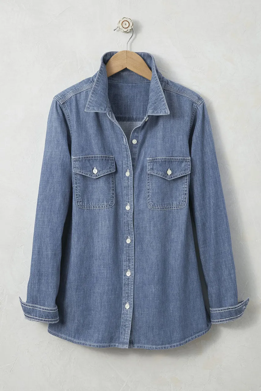 Versatile and lightweight, our denim shirt can be worn any way you like – layered under a sweater, buttoned on its own, or open as an easy layer on warmer days. Two patch pockets and pleated back yoke.