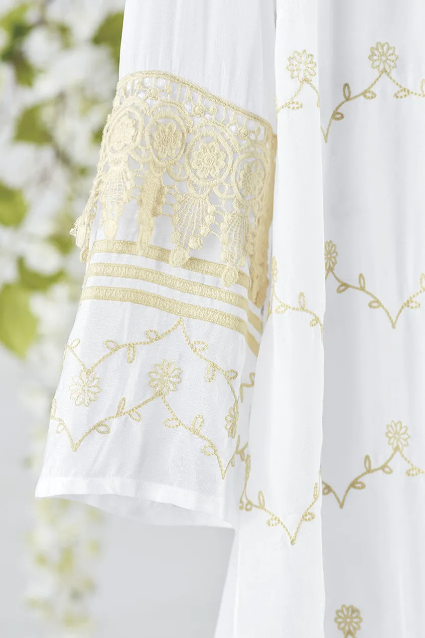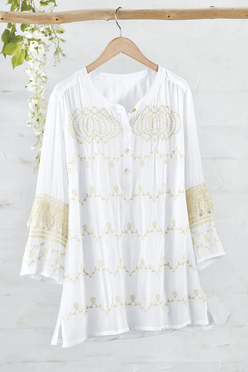 Lighthearted inspiration, with a silky drape. Our beautifully detailed slipover blouse feels light and refreshing, embellished with delicate embroidery and lace-trimmed elbow-length sleeves. Slightly sheer – we recommend wearing with one of our tanks or camis.