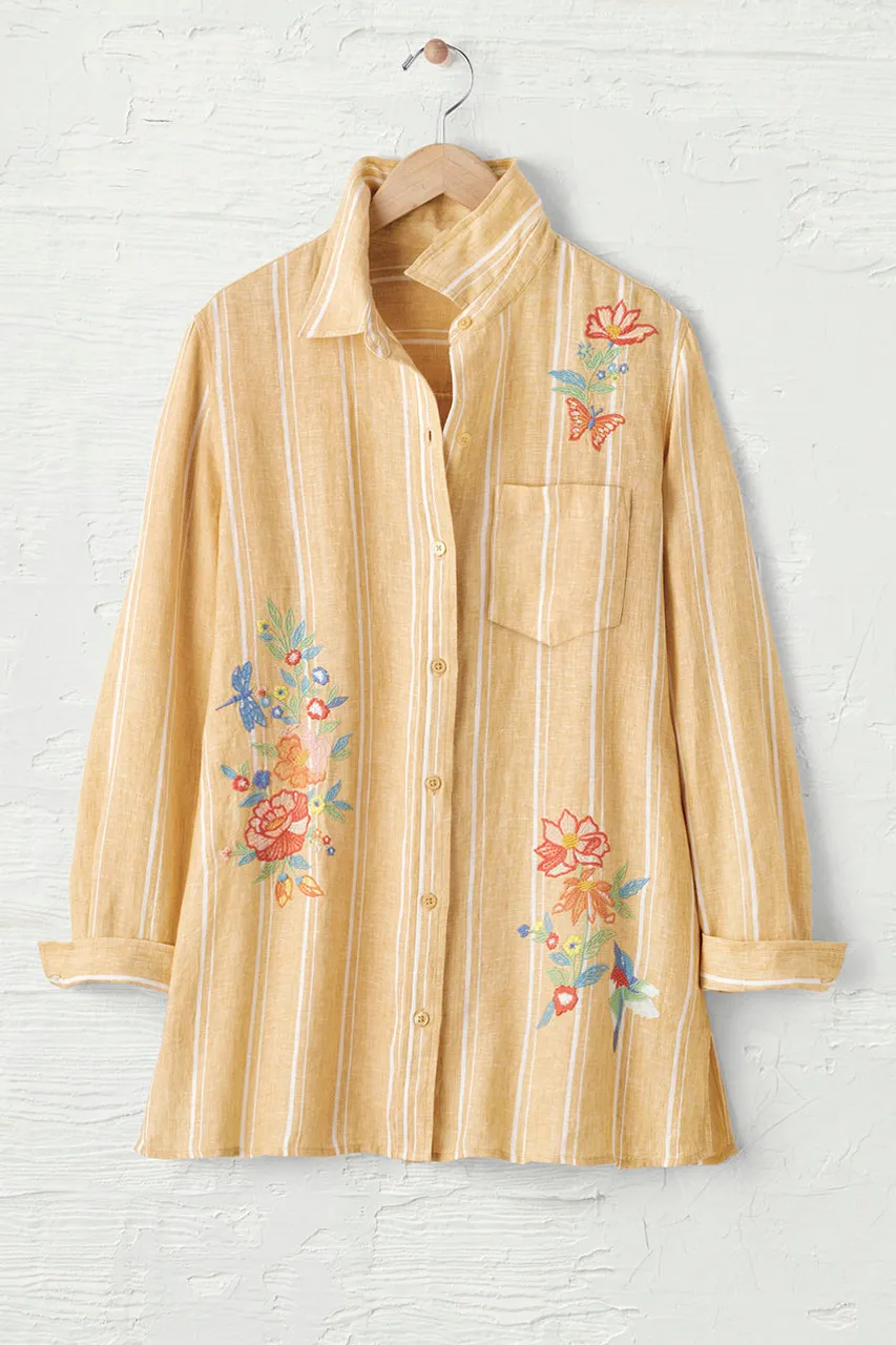 The lightweight big shirt you love, in European-grown linen – with sunny stripes and floral embroidery, mixed with whimsical winged friends. Updated with a roomier feel, long sleeves and a great longer length. Pleated back yoke, single chest pocket, side-slit hem.